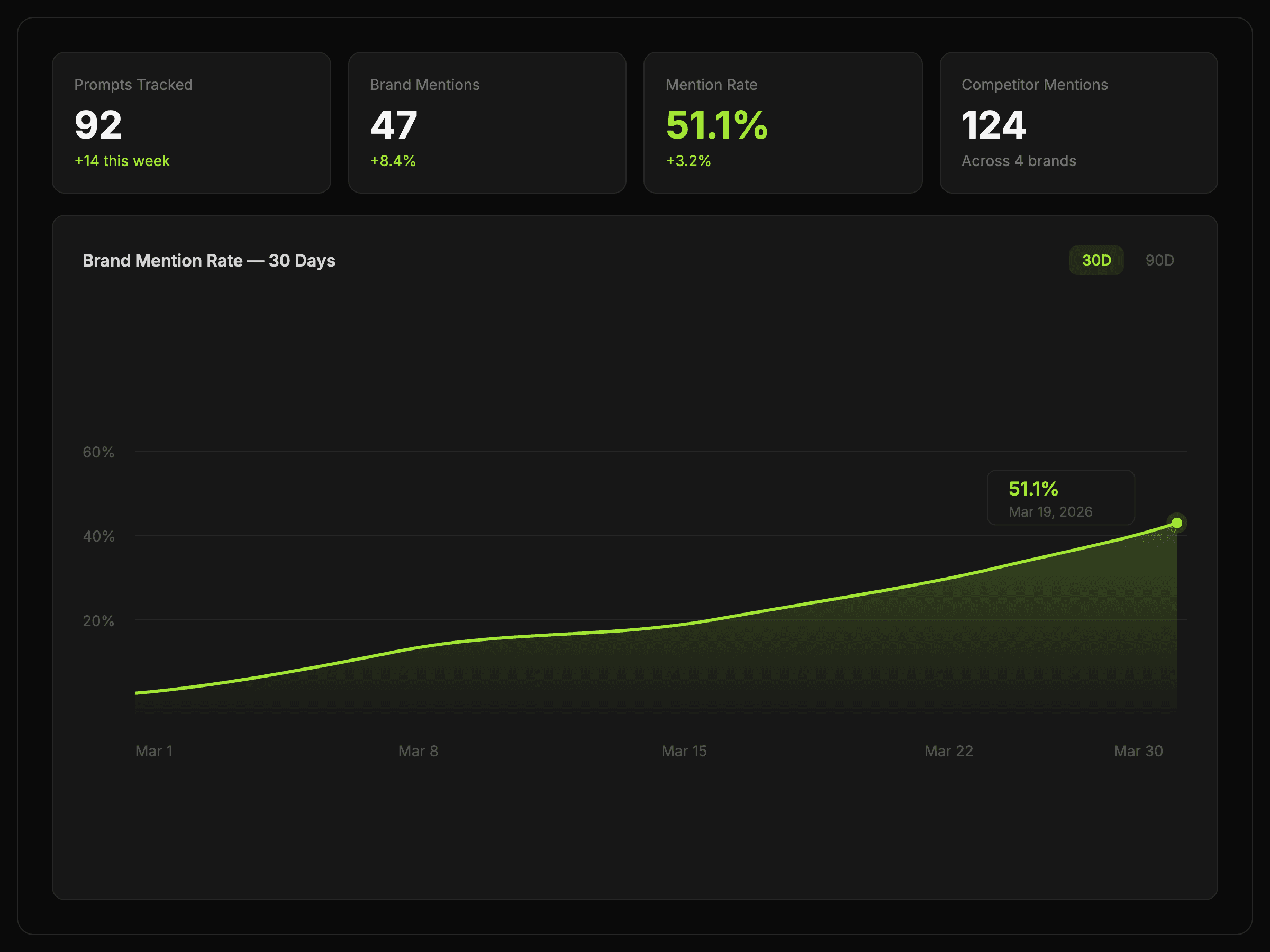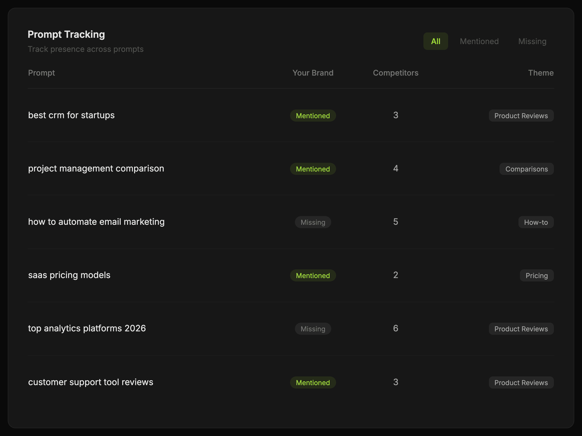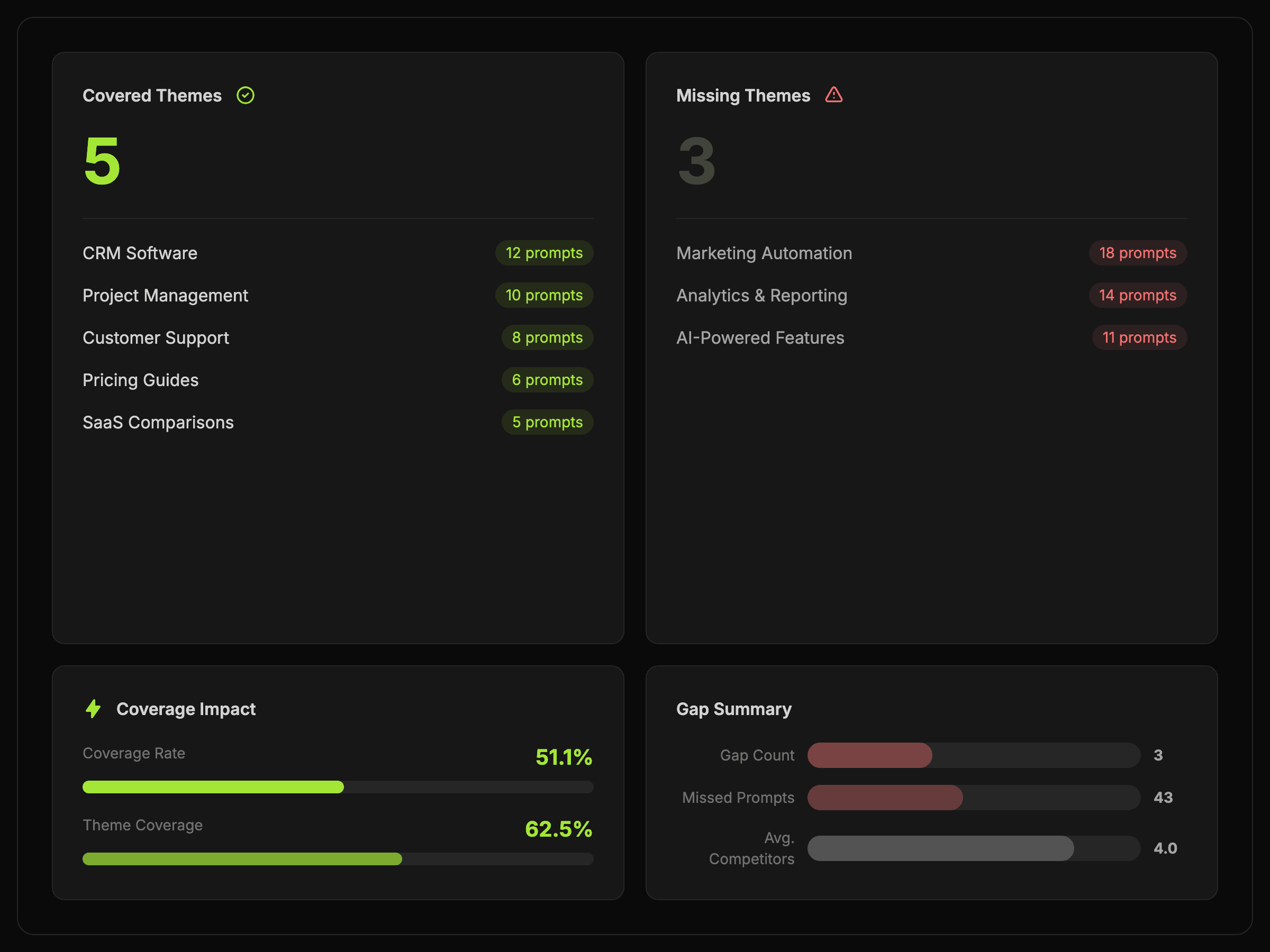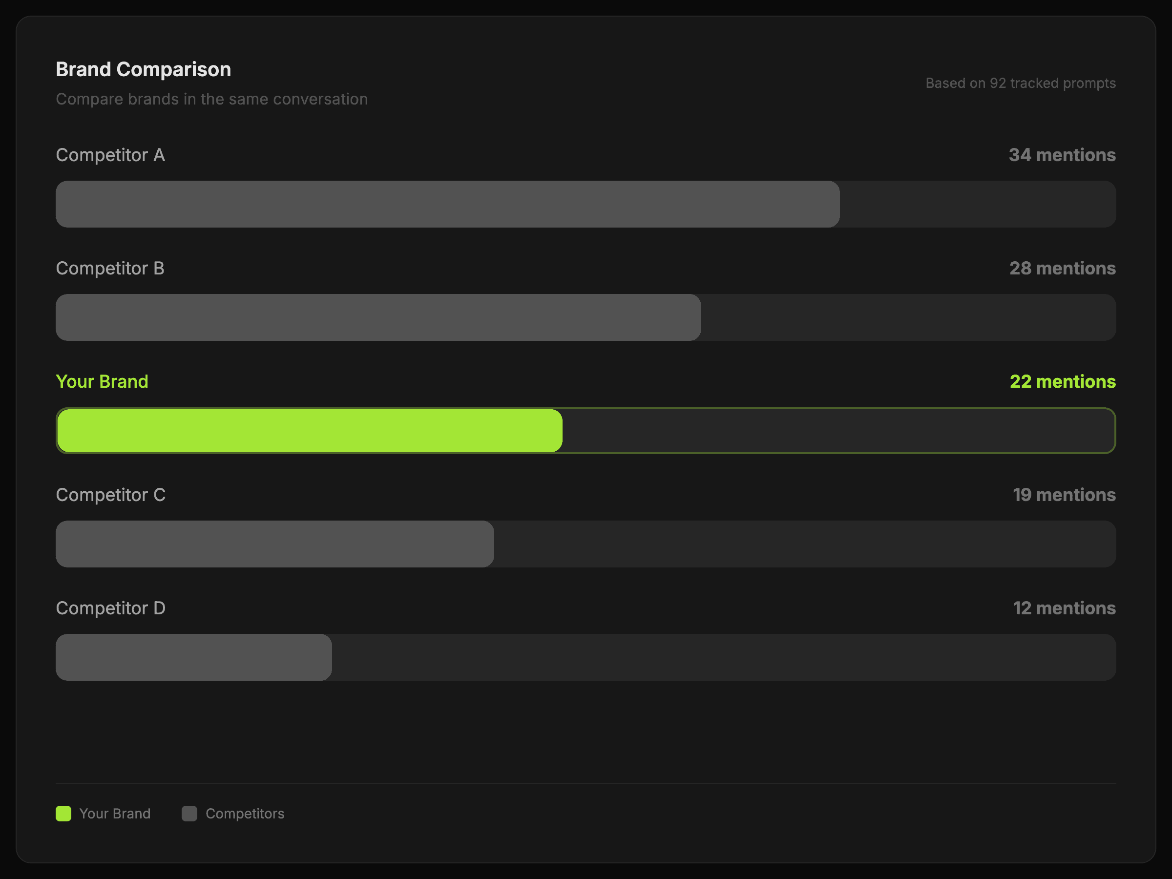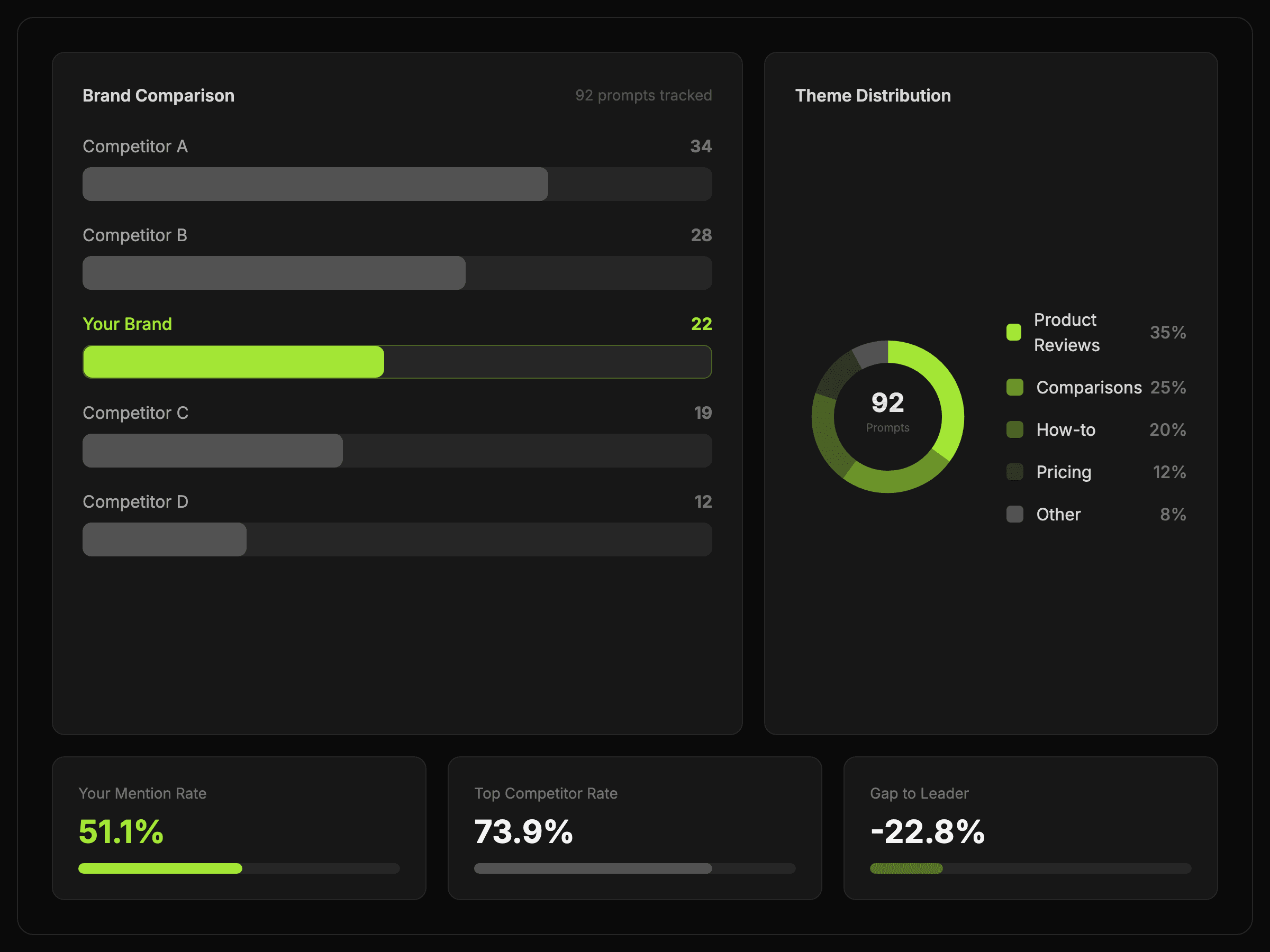 Monitor brand presence, compare competitive visibility, and focus on the prompts where stronger coverage is still needed.