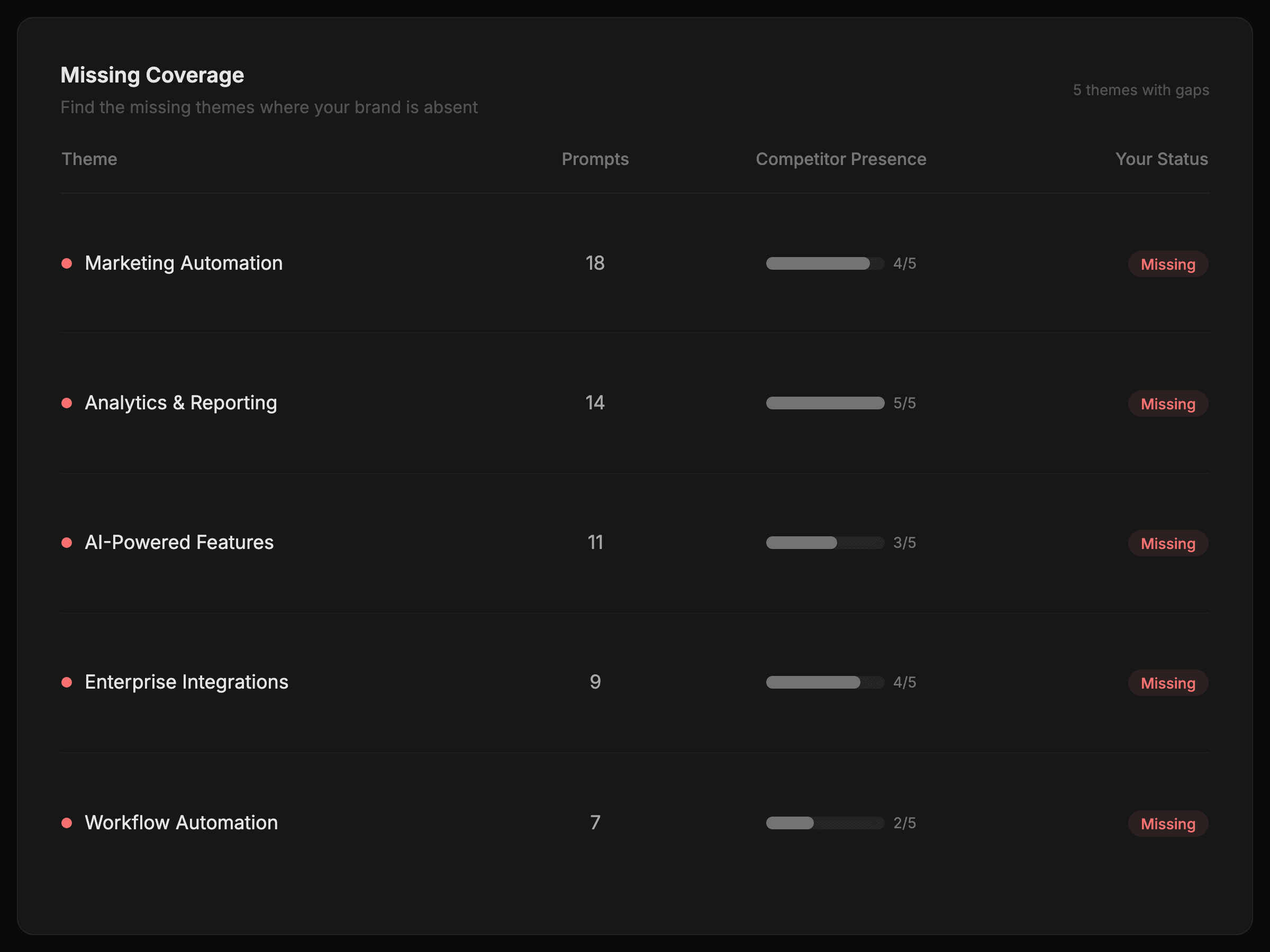 Spot the conversation areas where your brand is absent so the next coverage priority is easier to choose.