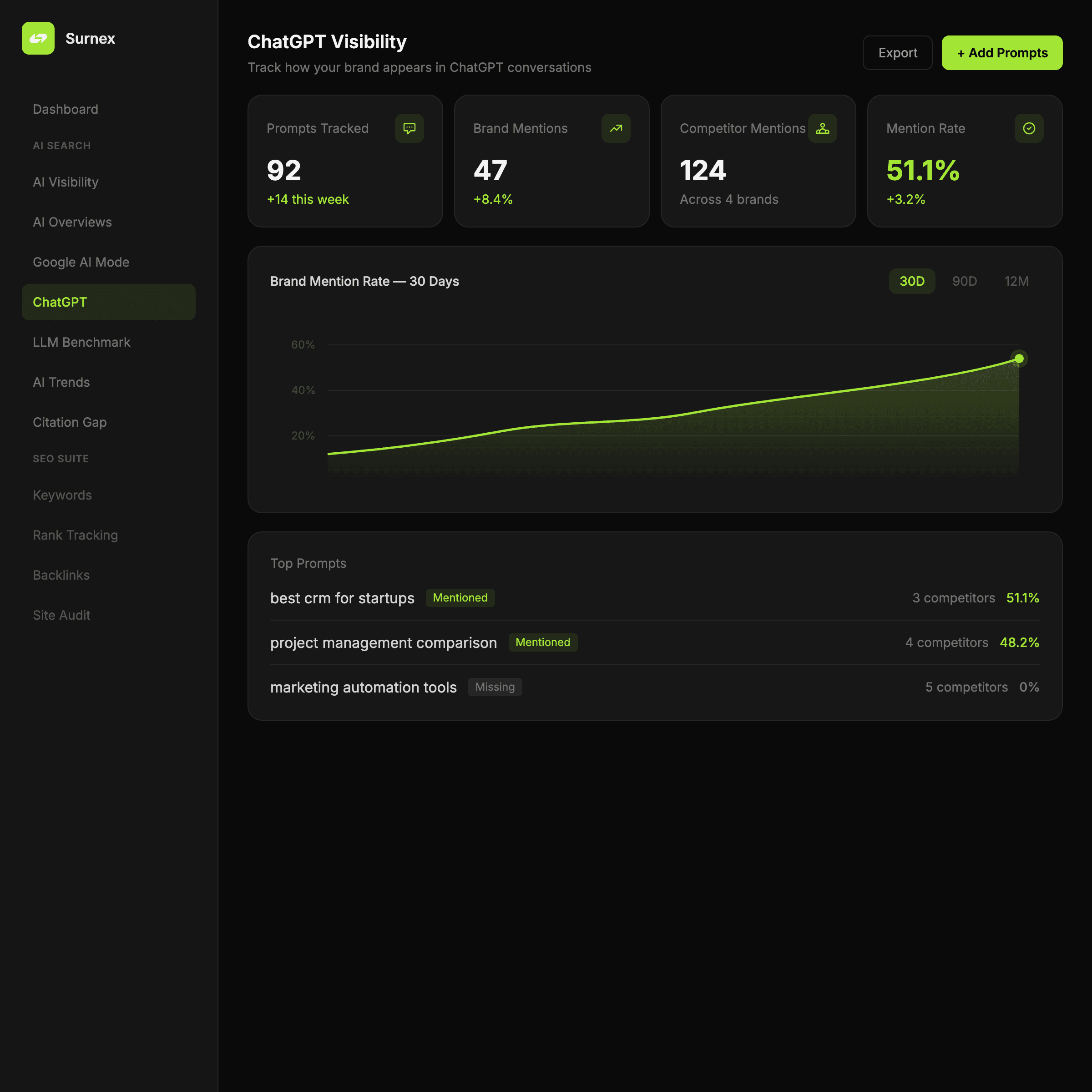 “Surnex helps us see how clients show up inside ChatGPT prompts that actually matter for discovery and comparison.”