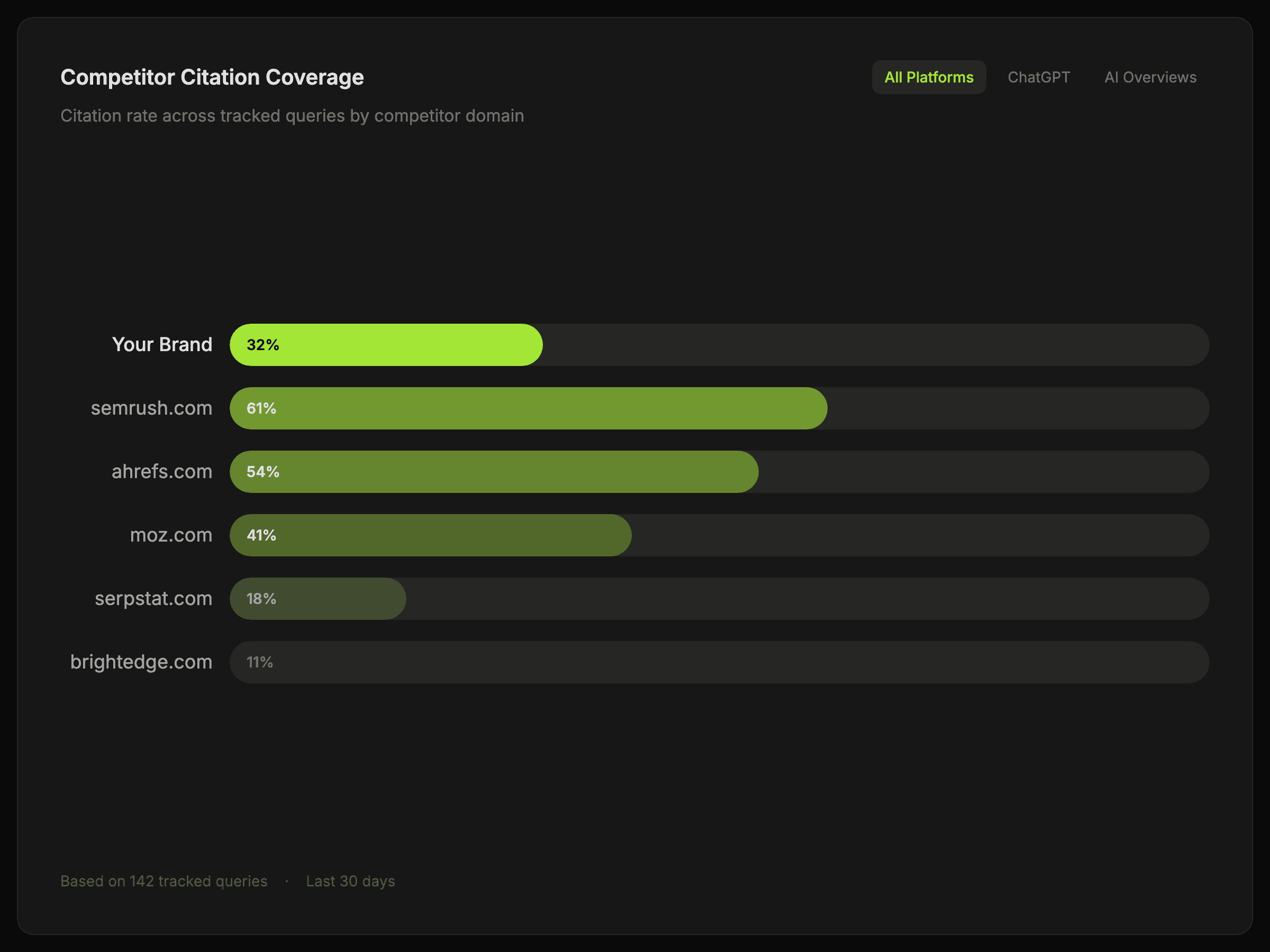 See which competitors are cited more often so your team can understand where authority and visibility are tilting away from you.