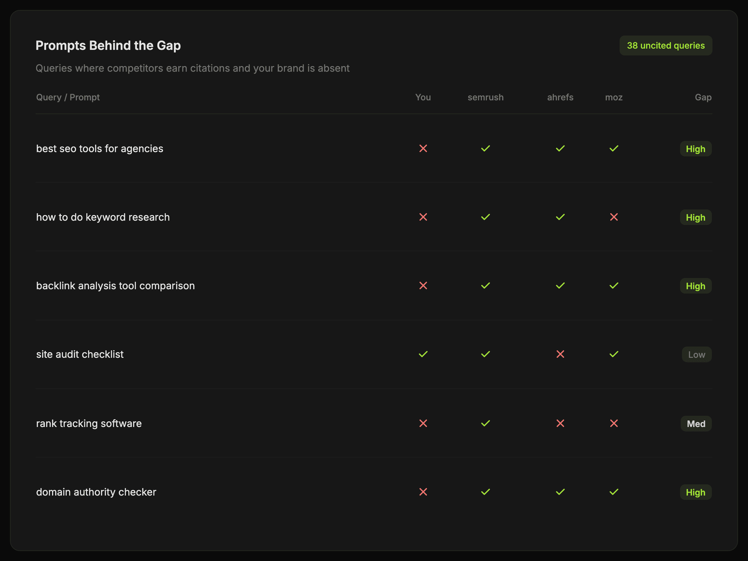 Pinpoint the queries and themes where competitors win citations and your brand is missing from the answer.