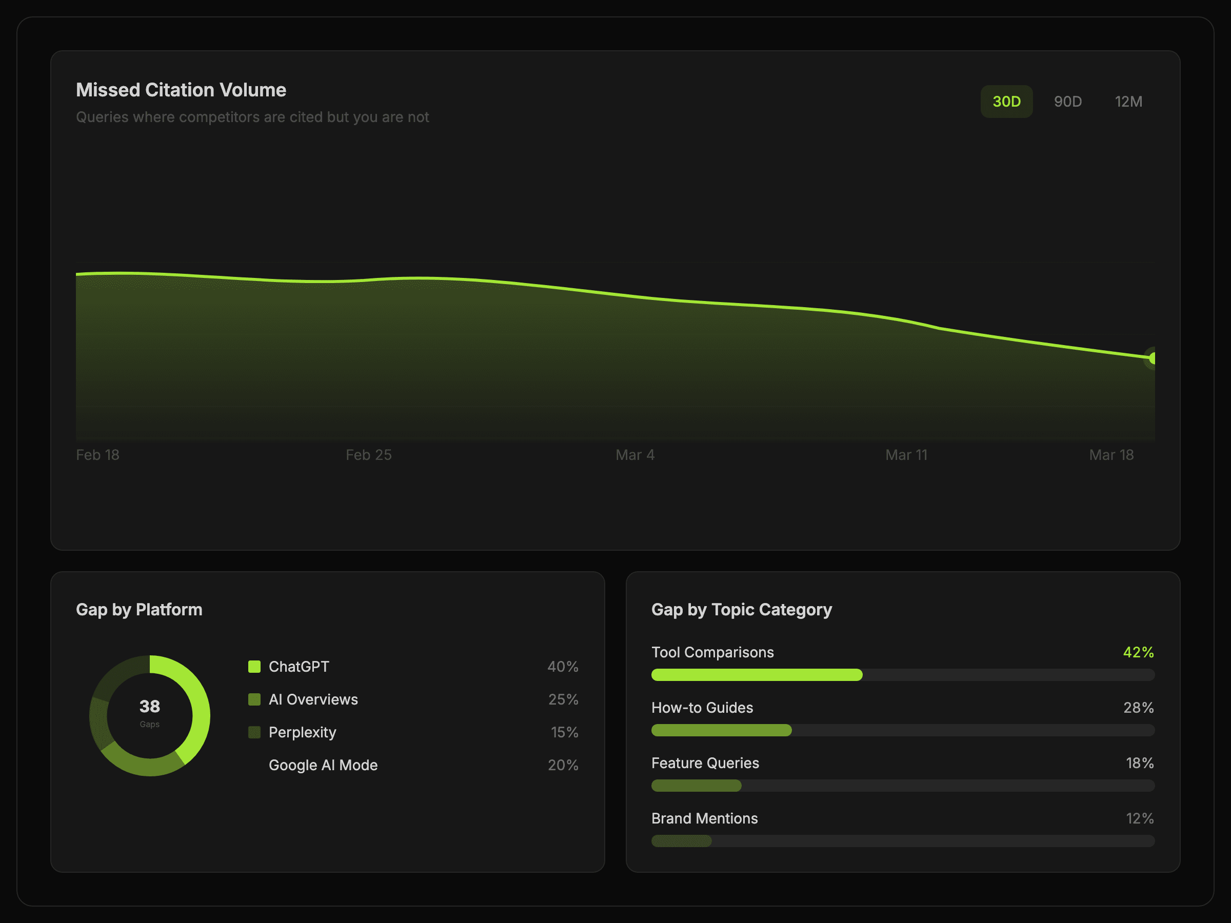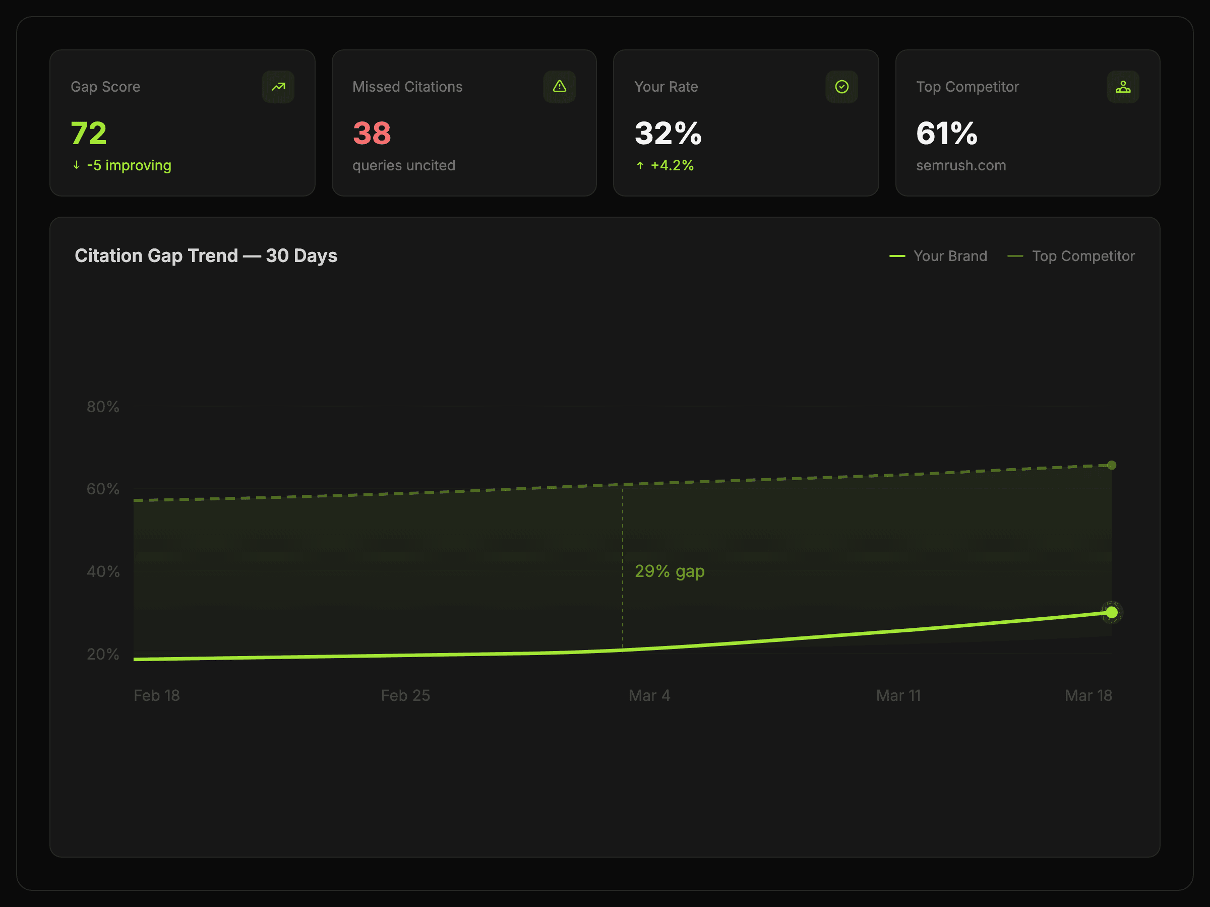 Use Citation Gap to compare competitive citation coverage, understand where your brand is absent, and decide what to improve next.