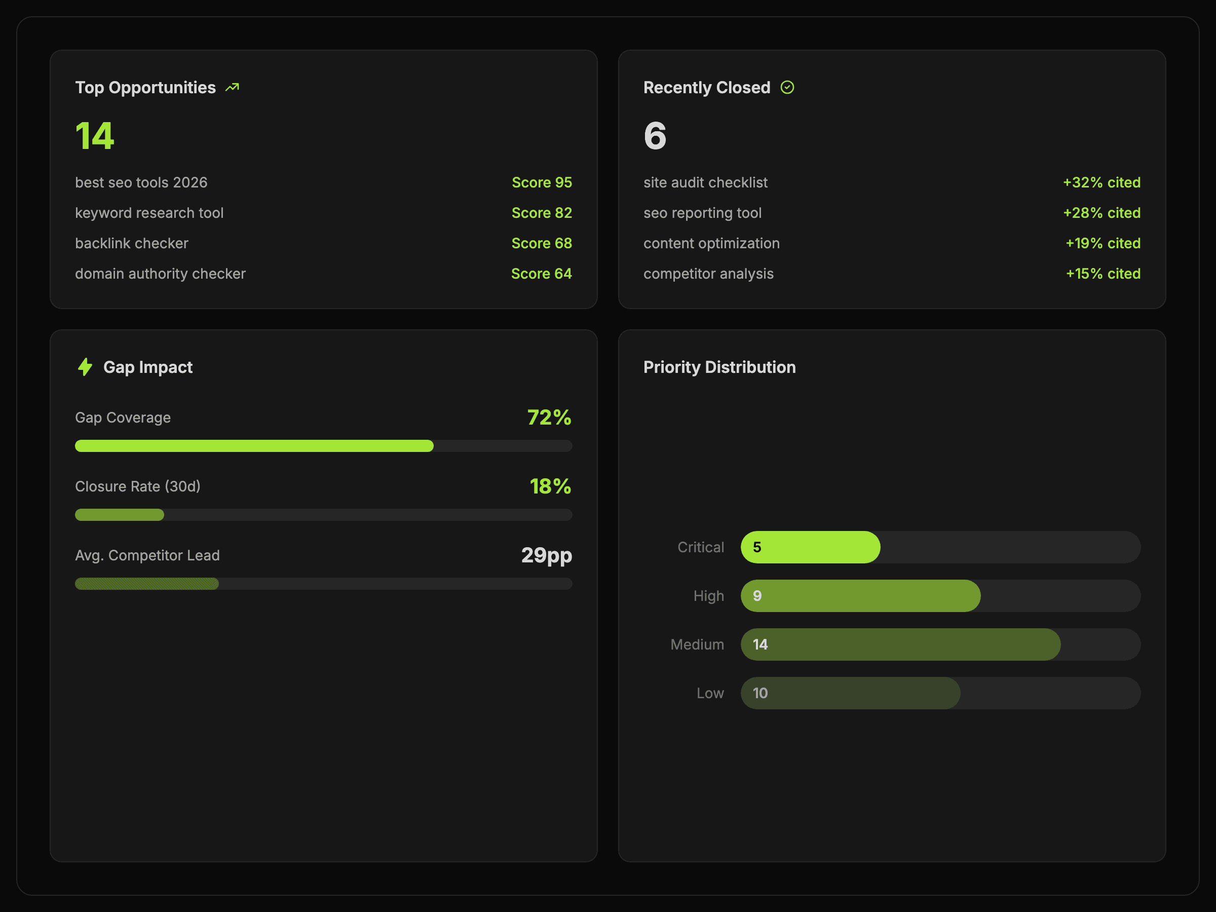 Compare competitor citation coverage, identify the prompts behind the gap, and focus on the opportunities most worth closing next.