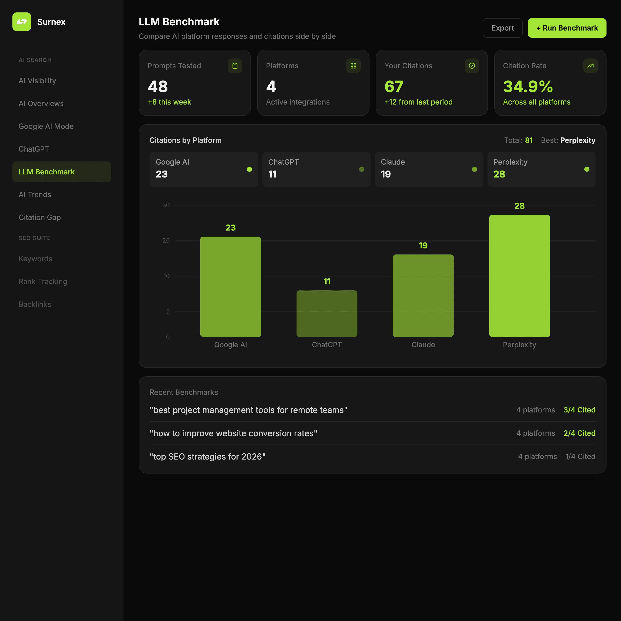 Use LLM Benchmarking to compare responses side by side so your team can spot differences in mentions, citations, and framing.