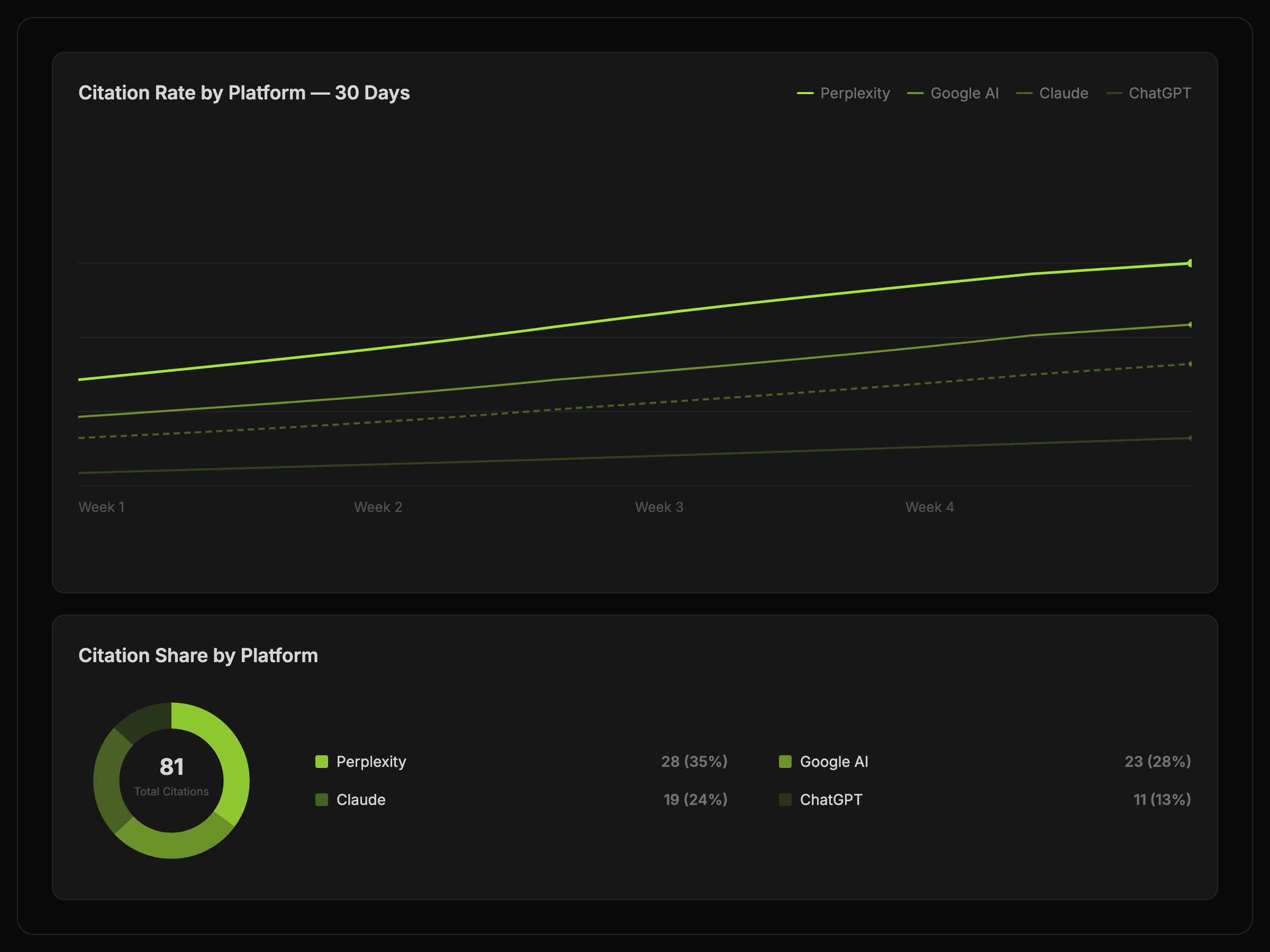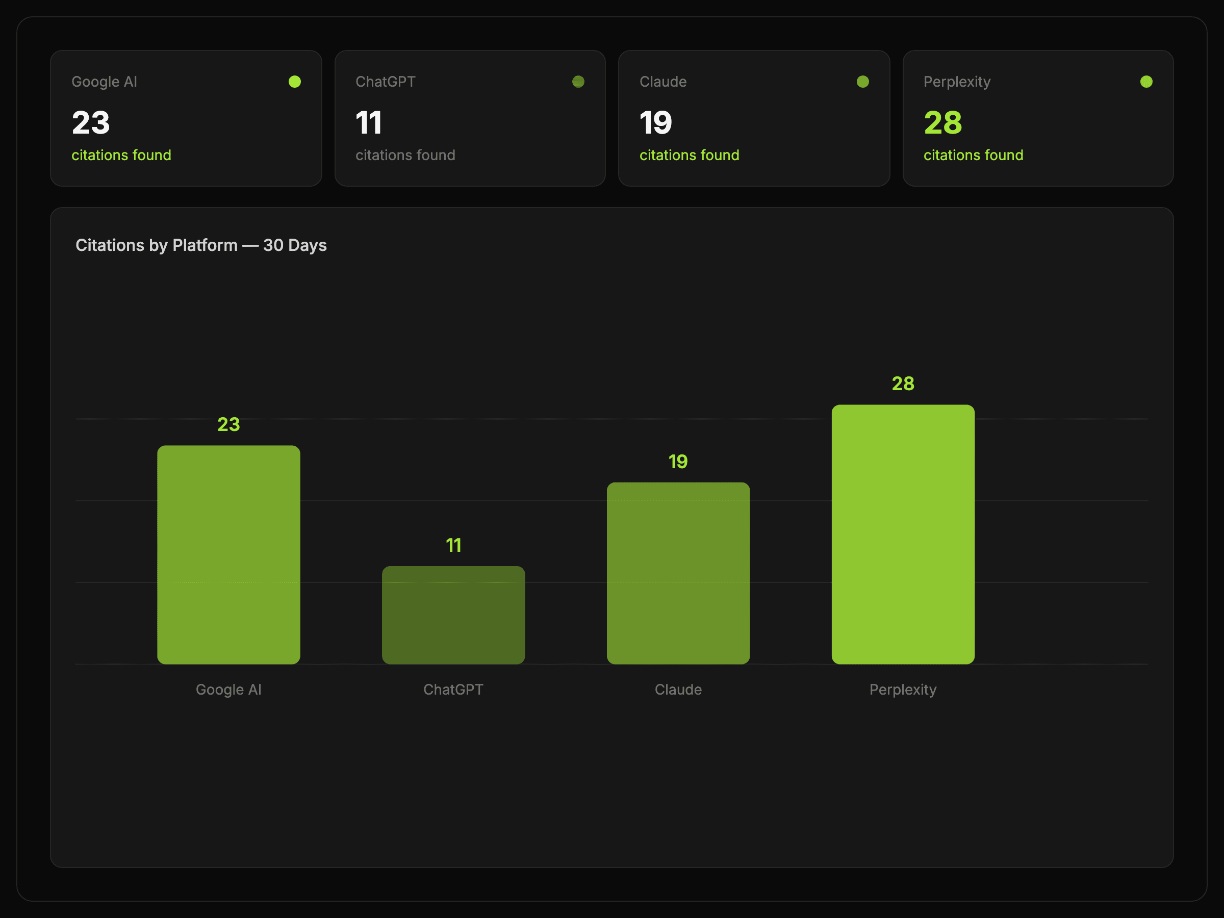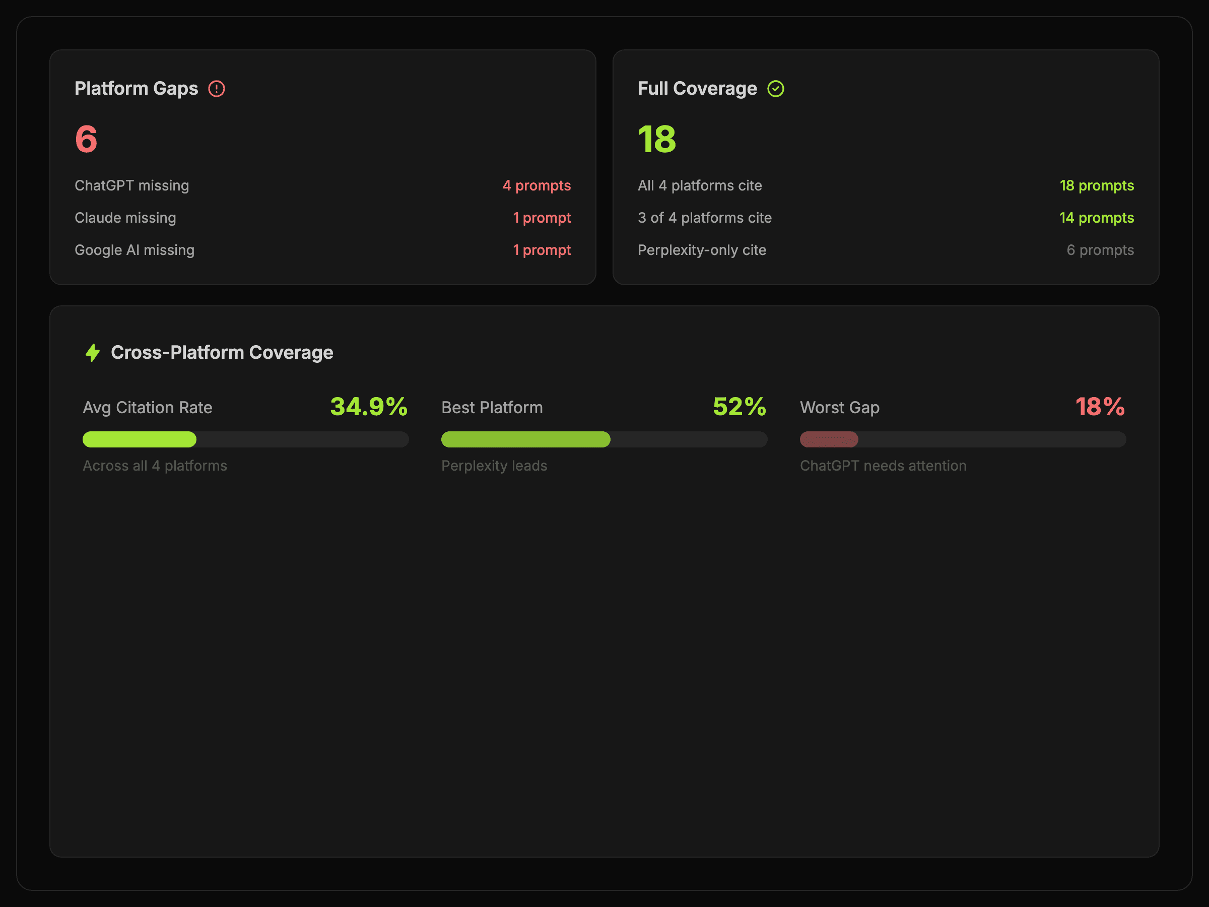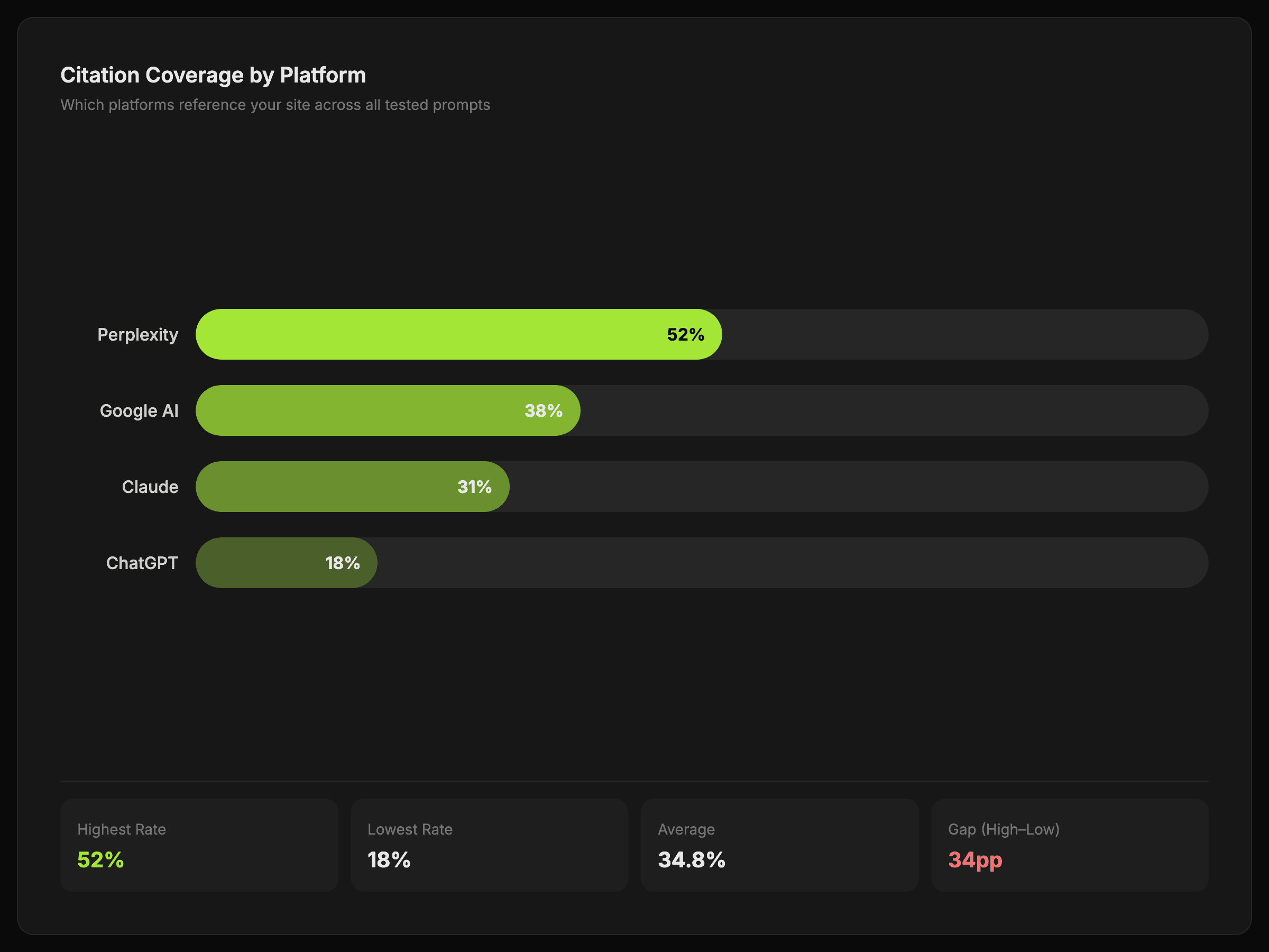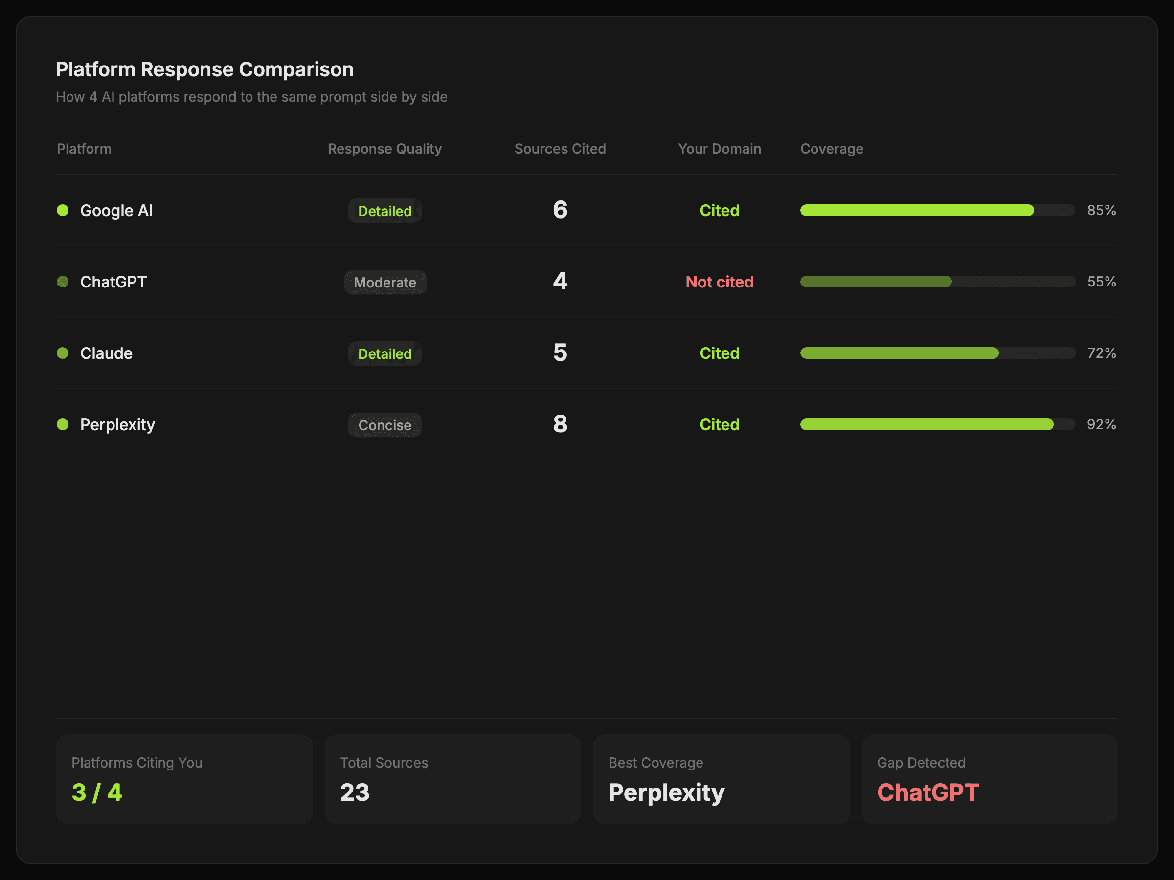 Compare how Google AI, ChatGPT, Claude, and Perplexity answer the same prompt and see where your domain earns citations.