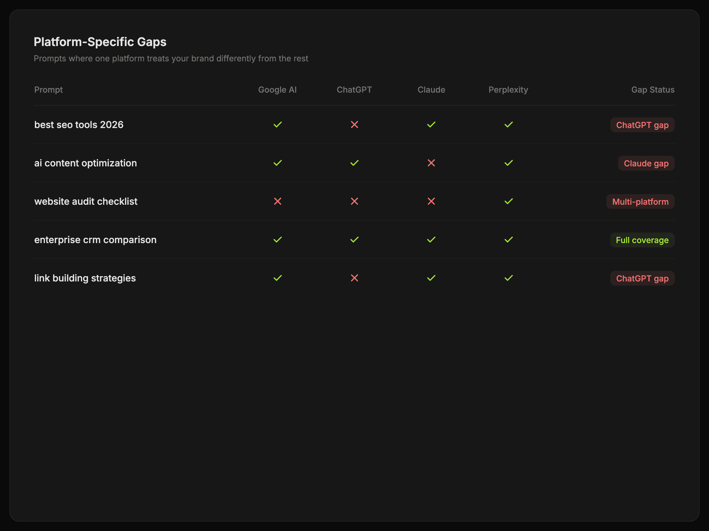 Review how Google AI, ChatGPT, Claude, and Perplexity respond to the same prompt without jumping between tools.