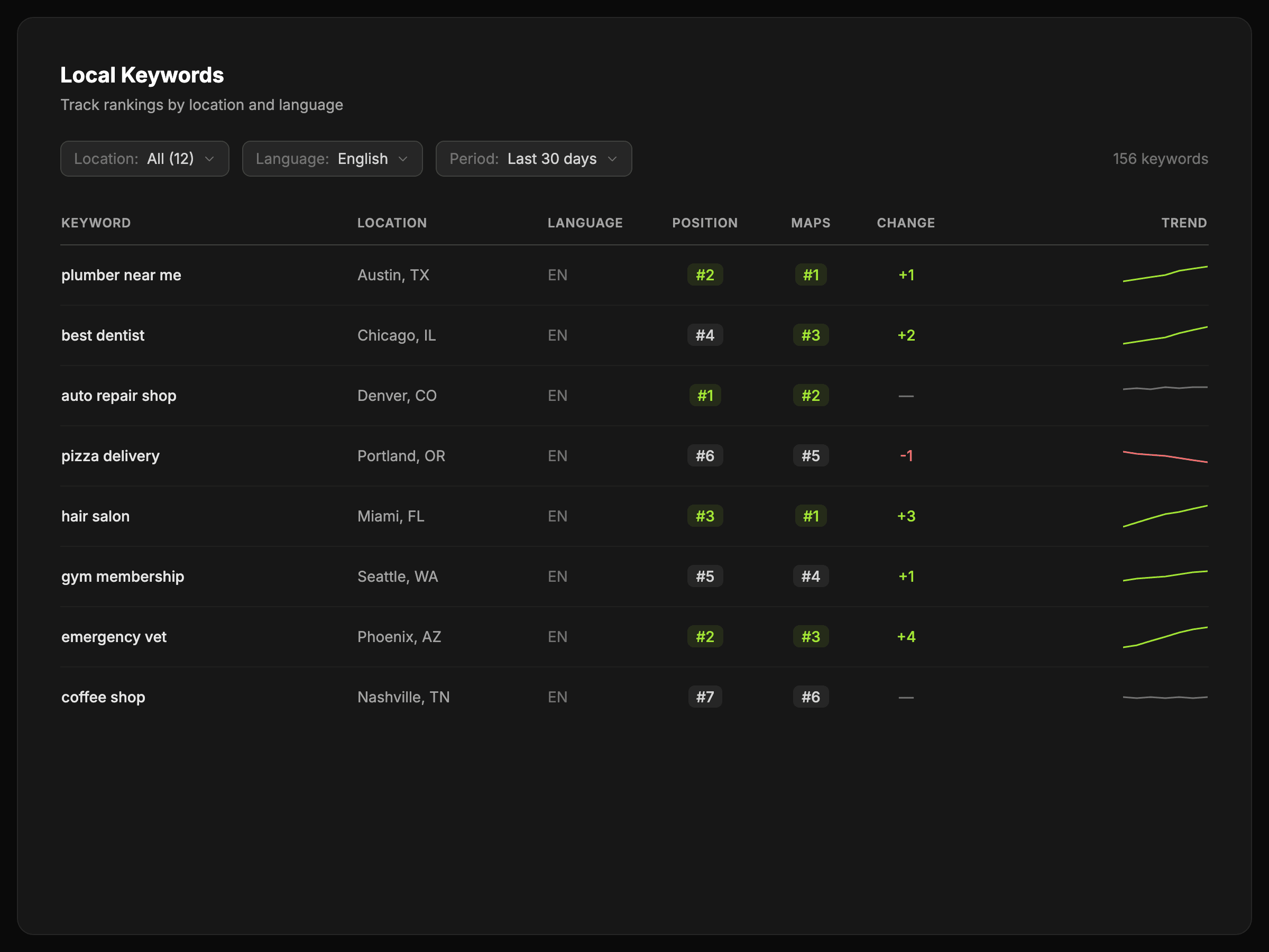 Use top 3 coverage, average position, and trend views to see whether local visibility is strengthening or slipping.