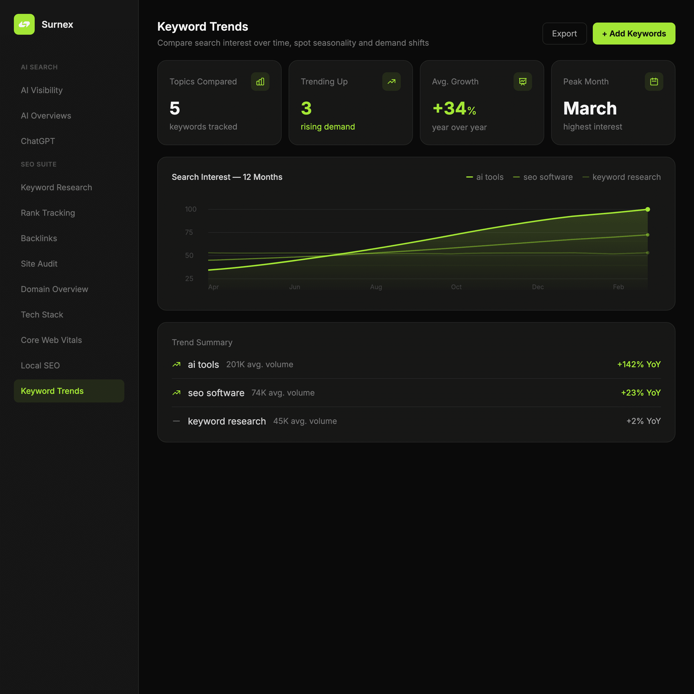 Use Keyword Trends to compare topics side by side, spot seasonal patterns, and identify demand shifts early enough to influence planning.