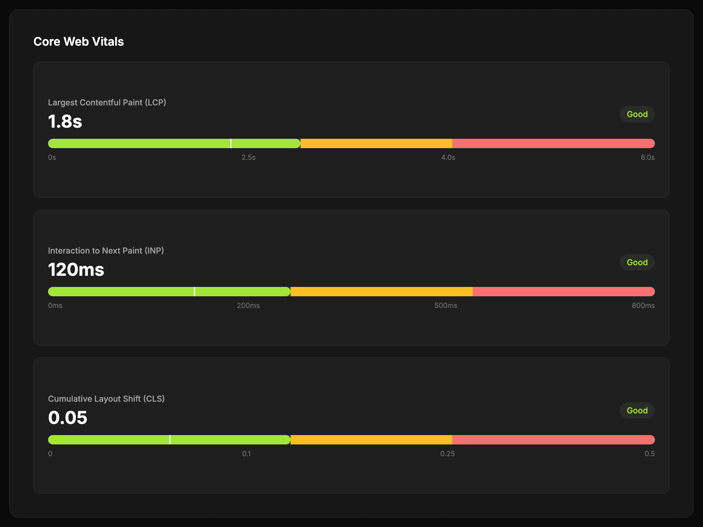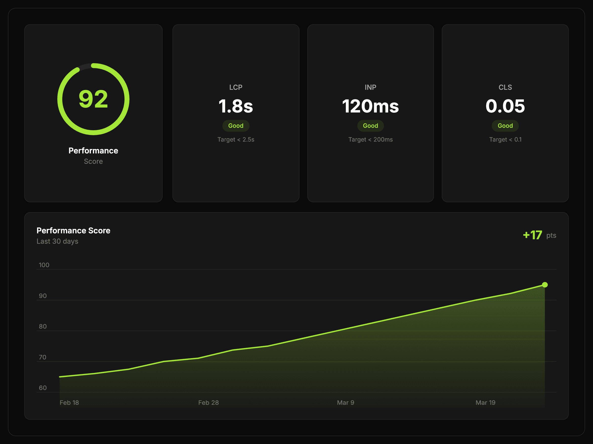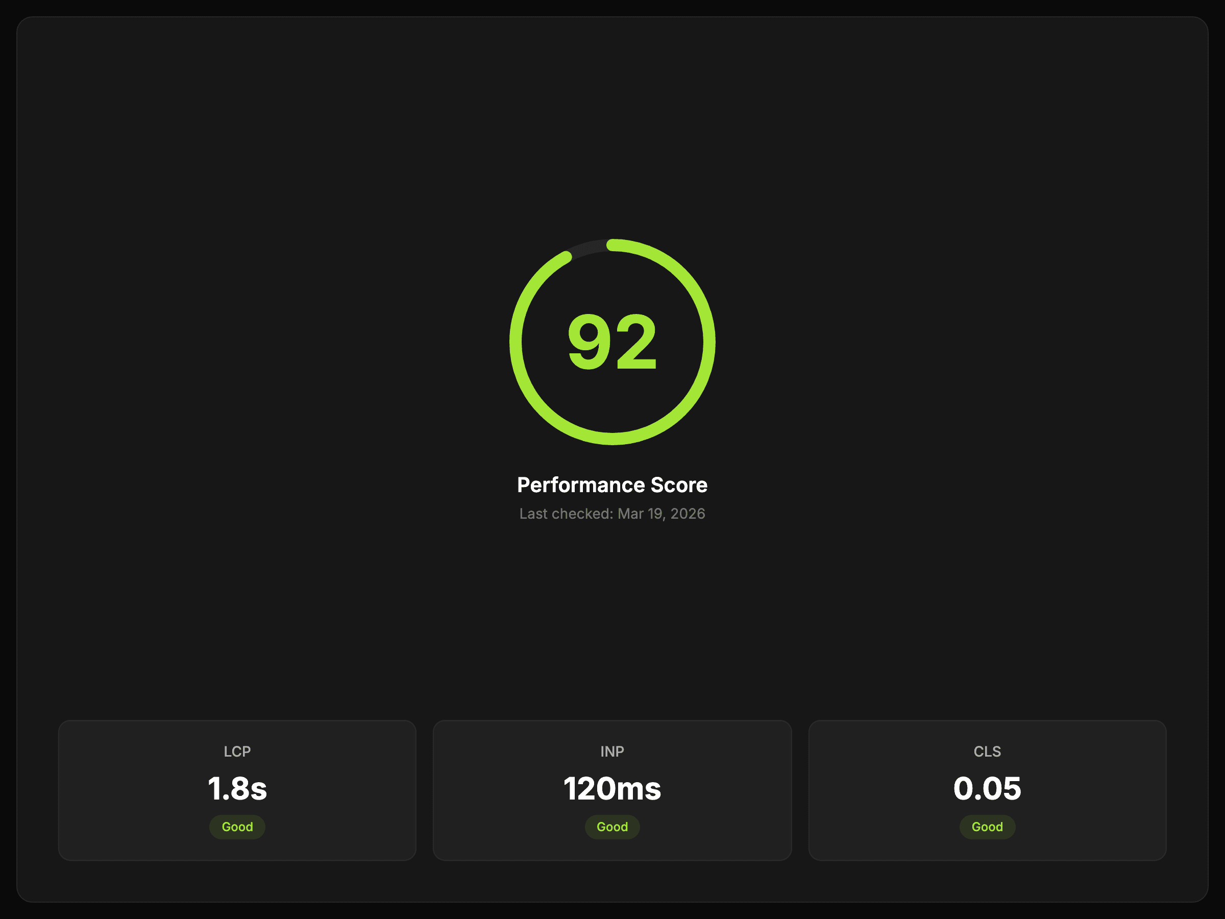 Inspect LCP, INP, and CLS alongside related performance signals so the score is easier to interpret.
