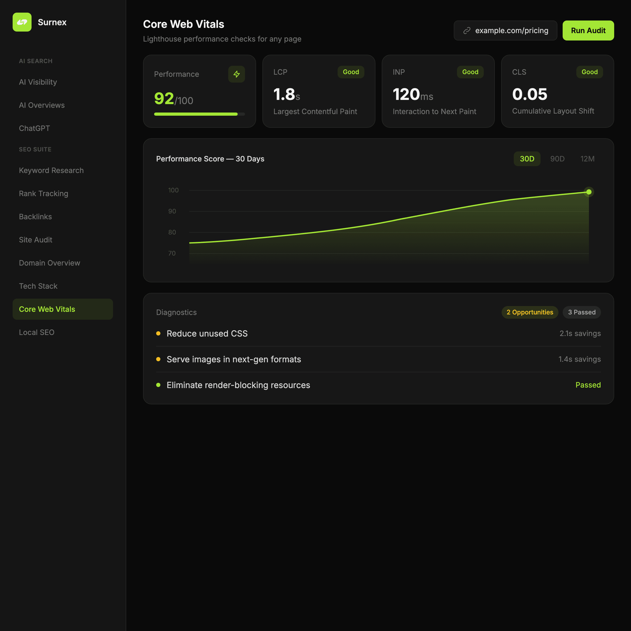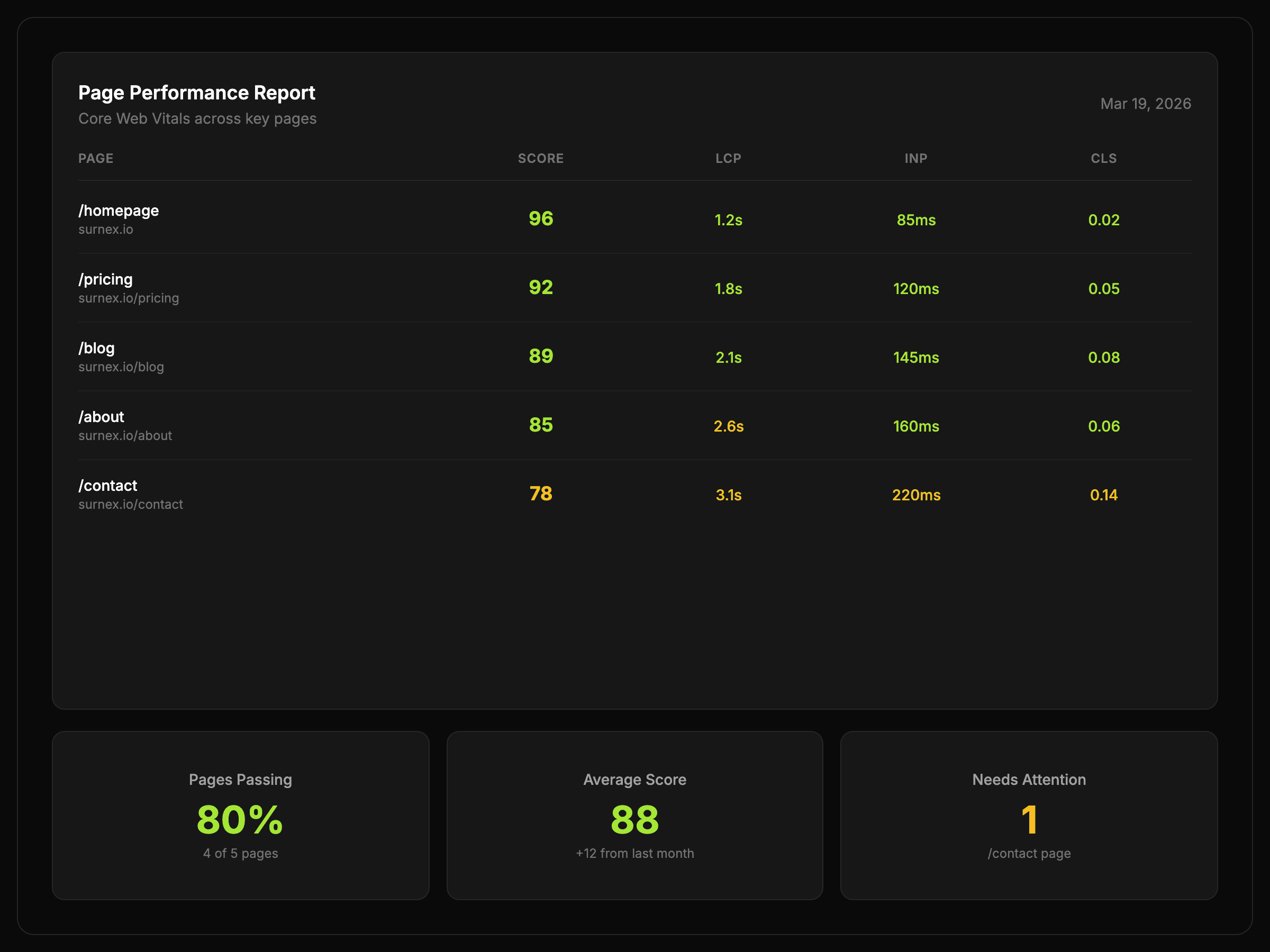 “Surnex makes page performance easier to review because the score and the key metrics sit in one clean workflow.”