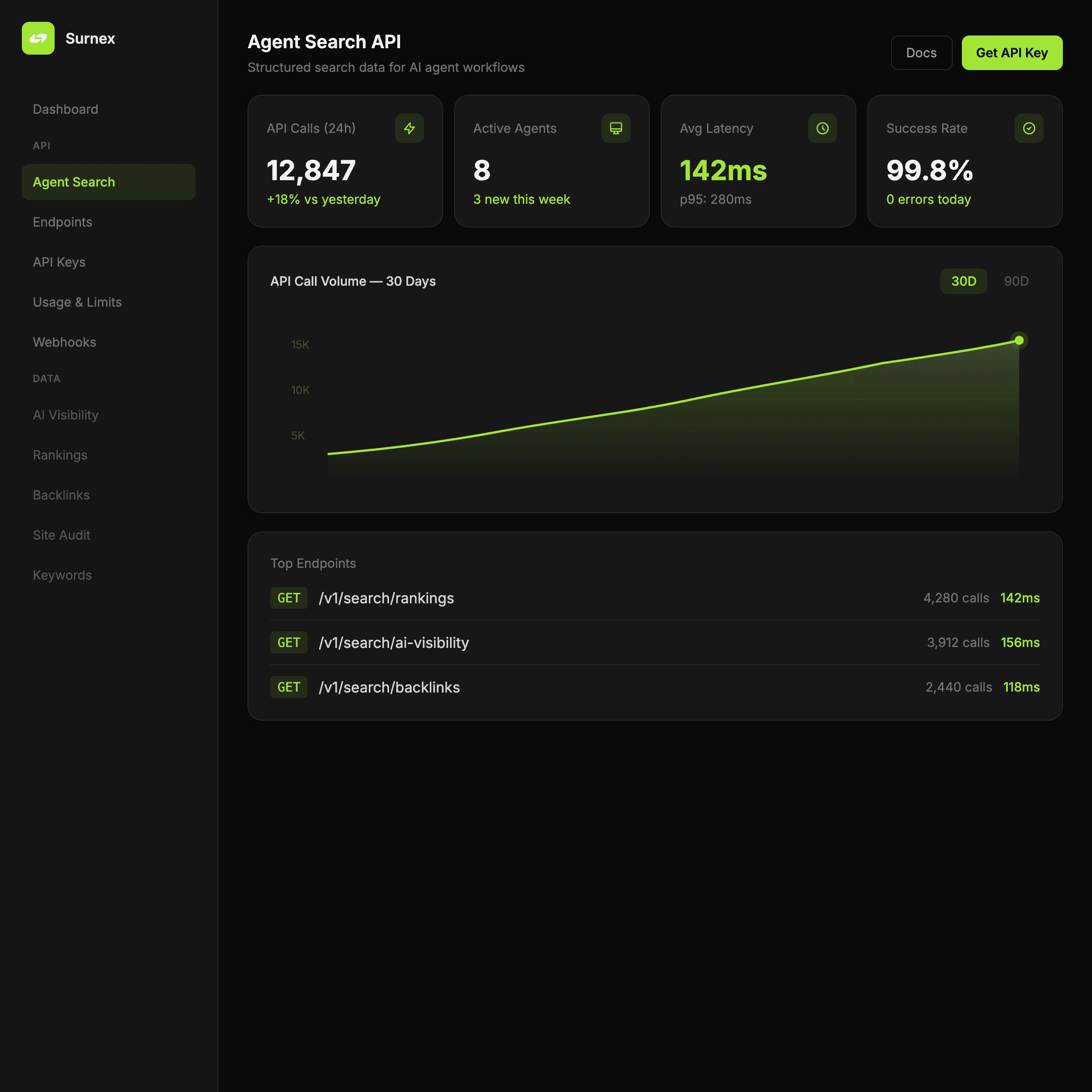 Give AI agents structured search and SEO capability through one API, clean docs, and outputs built for natural-language workflows.