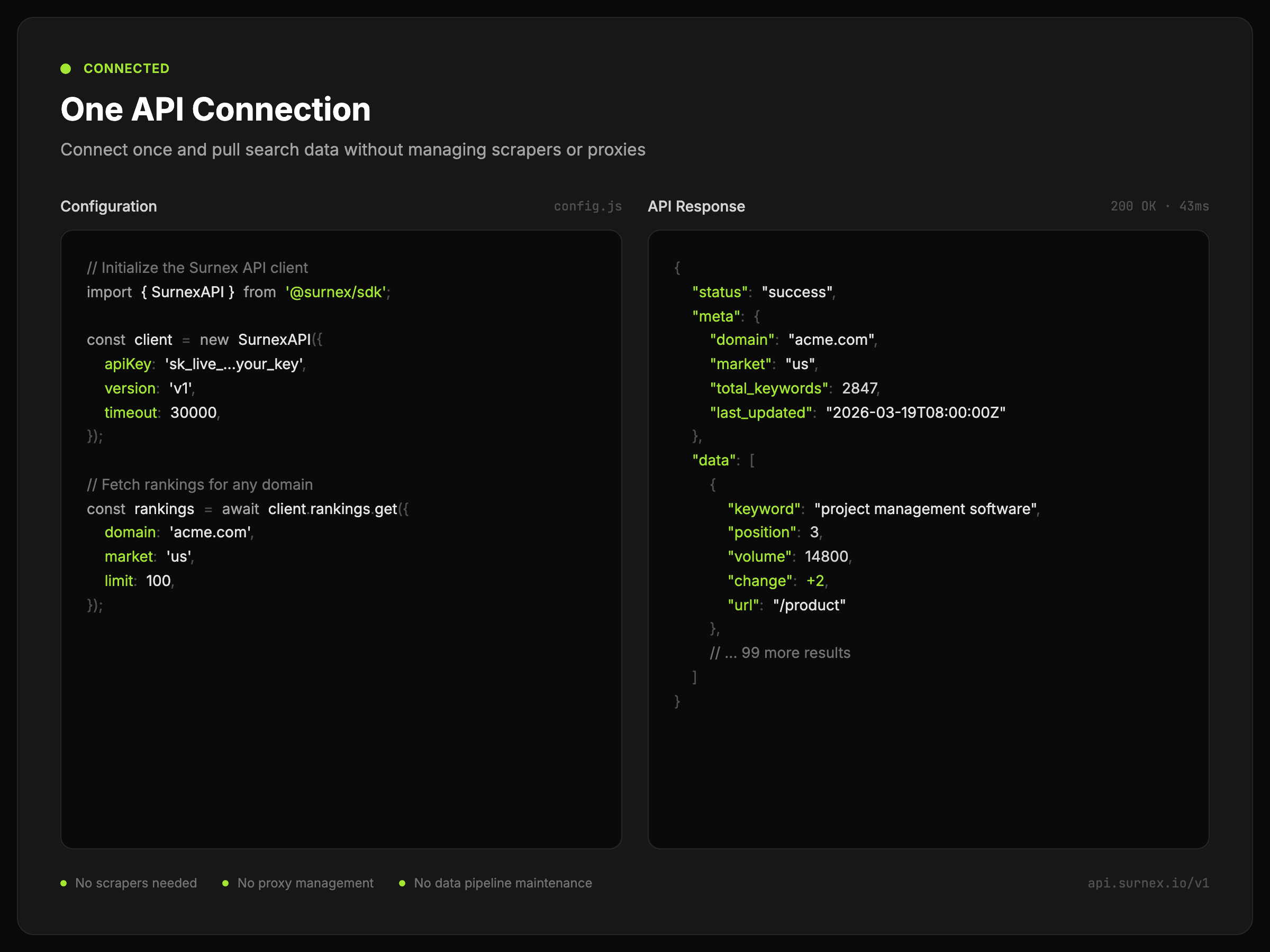 Connect once and pull the search data your product needs without managing multiple vendors and endpoints.