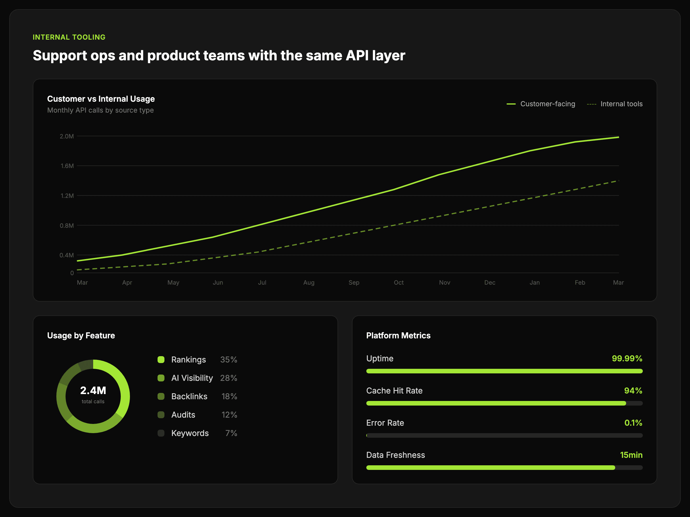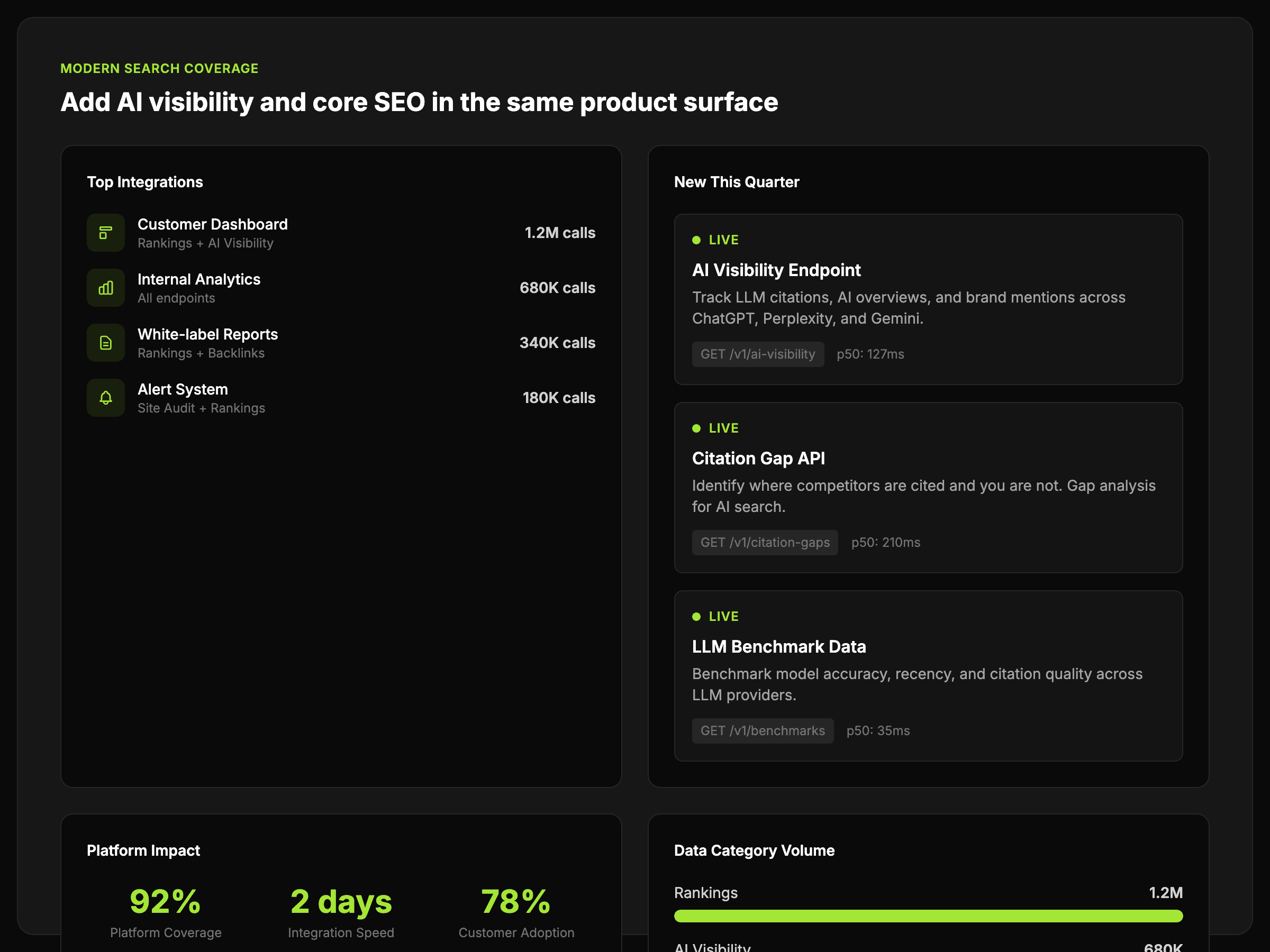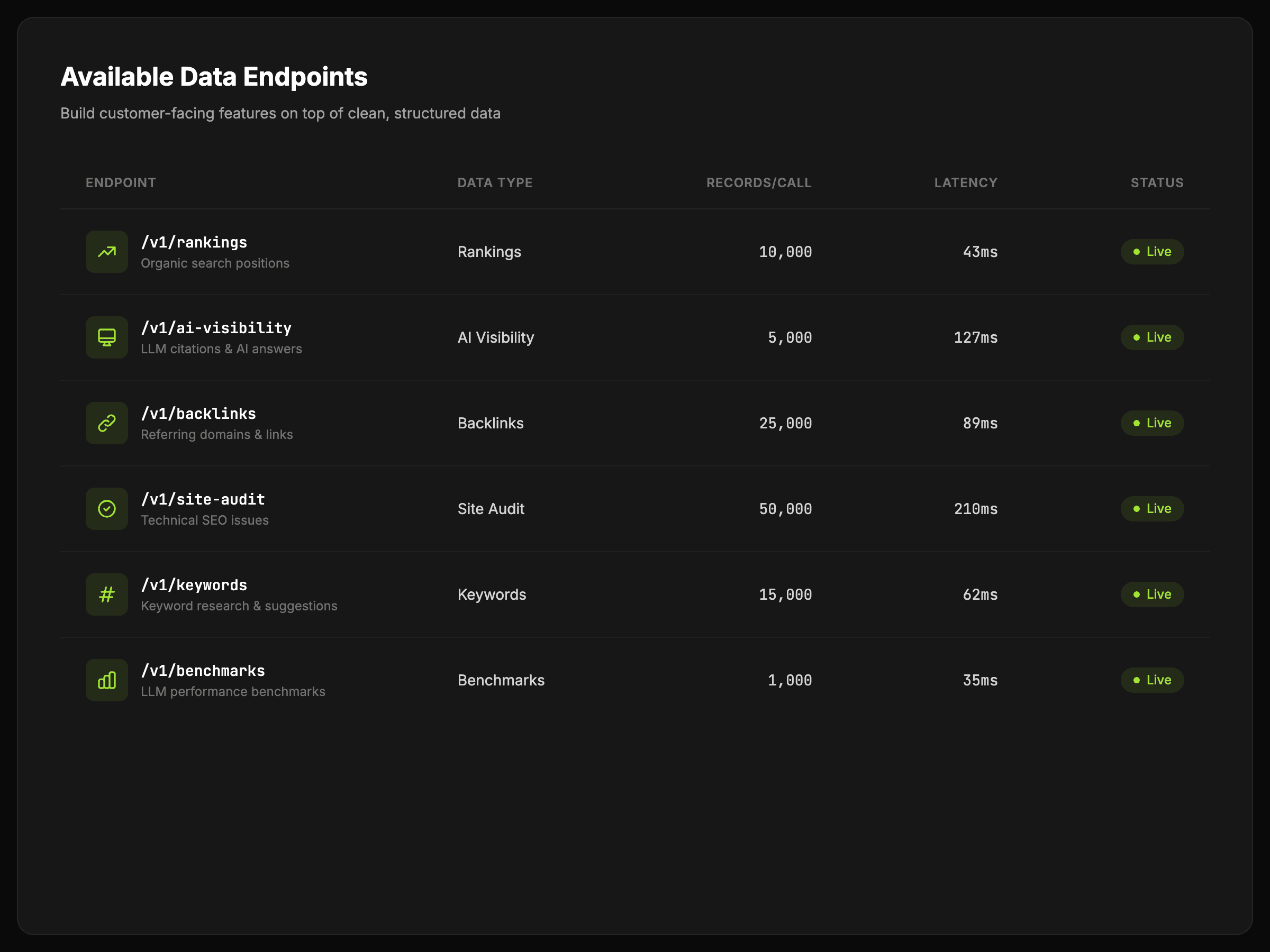 Embed AI visibility and SEO data into product features, internal tools, and automated workflows without building the data layer yourself.
