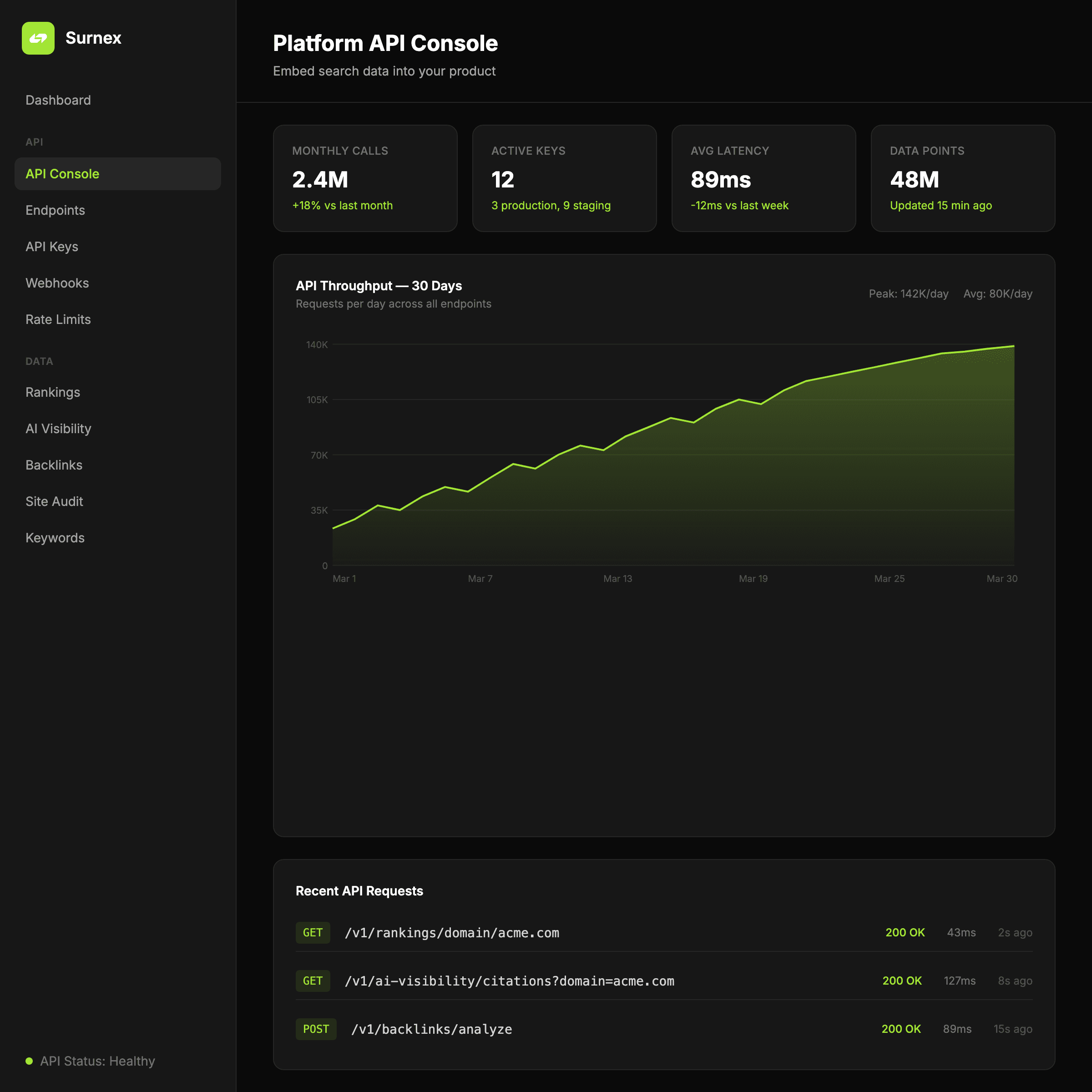 Embed AI visibility, rankings, backlinks, audits, and search workflows into your product without building the data layer from scratch.