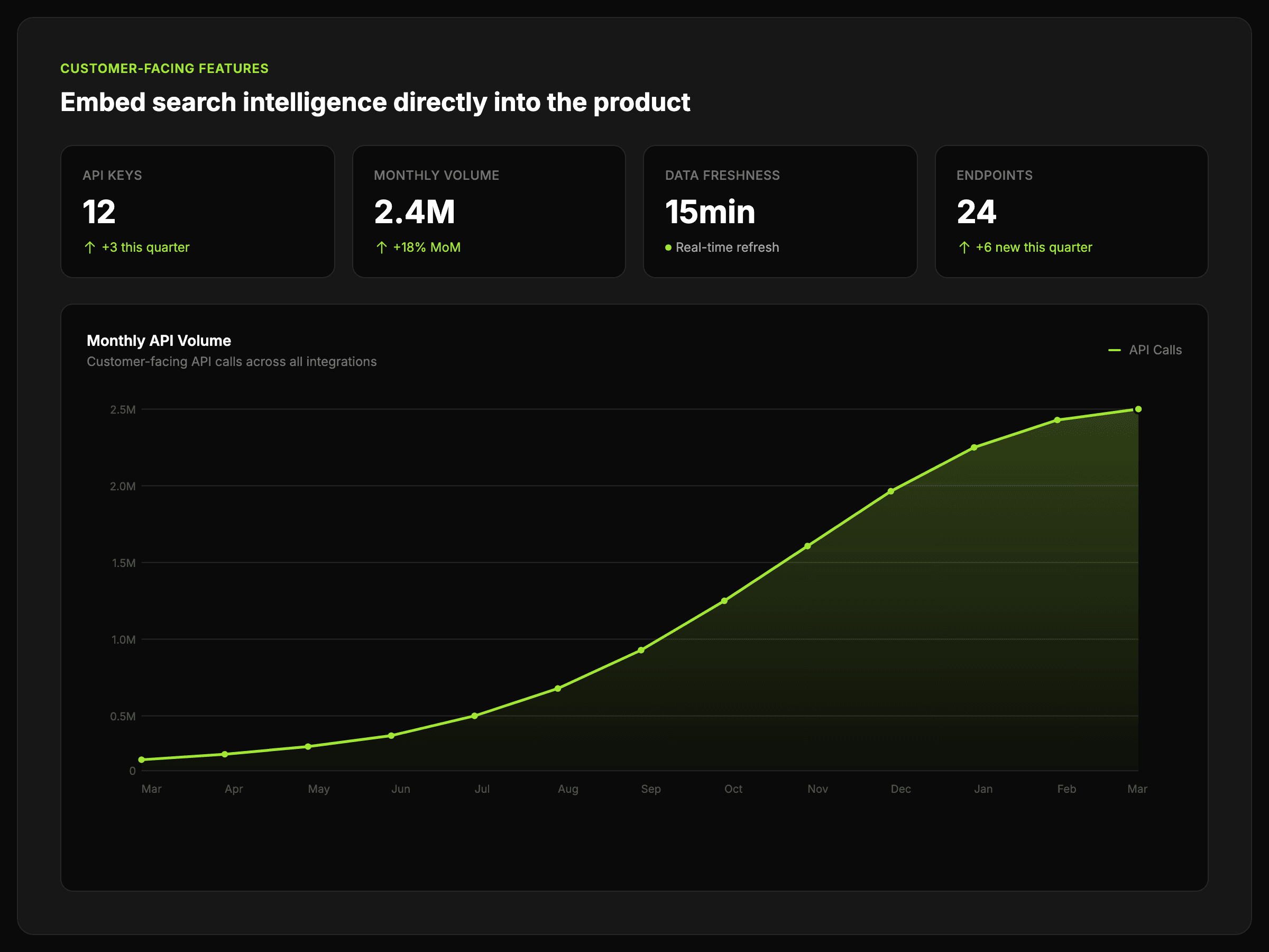 For SaaS teams that want customer-facing search intelligence, internal tooling, and faster feature delivery without extra data infrastructure work.