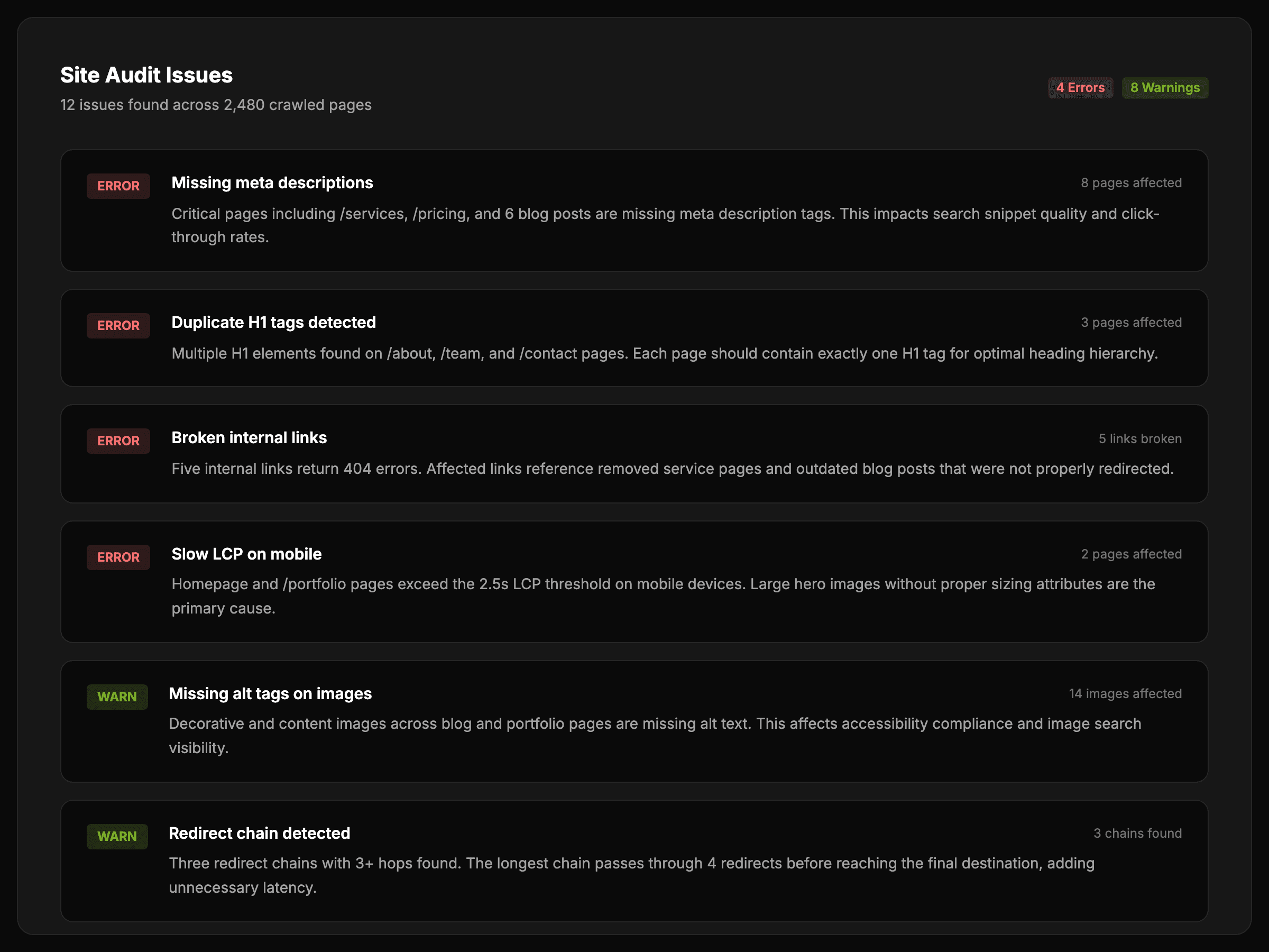 Track technical quality, visibility, and reporting in one place so recurring client support is easier to run.