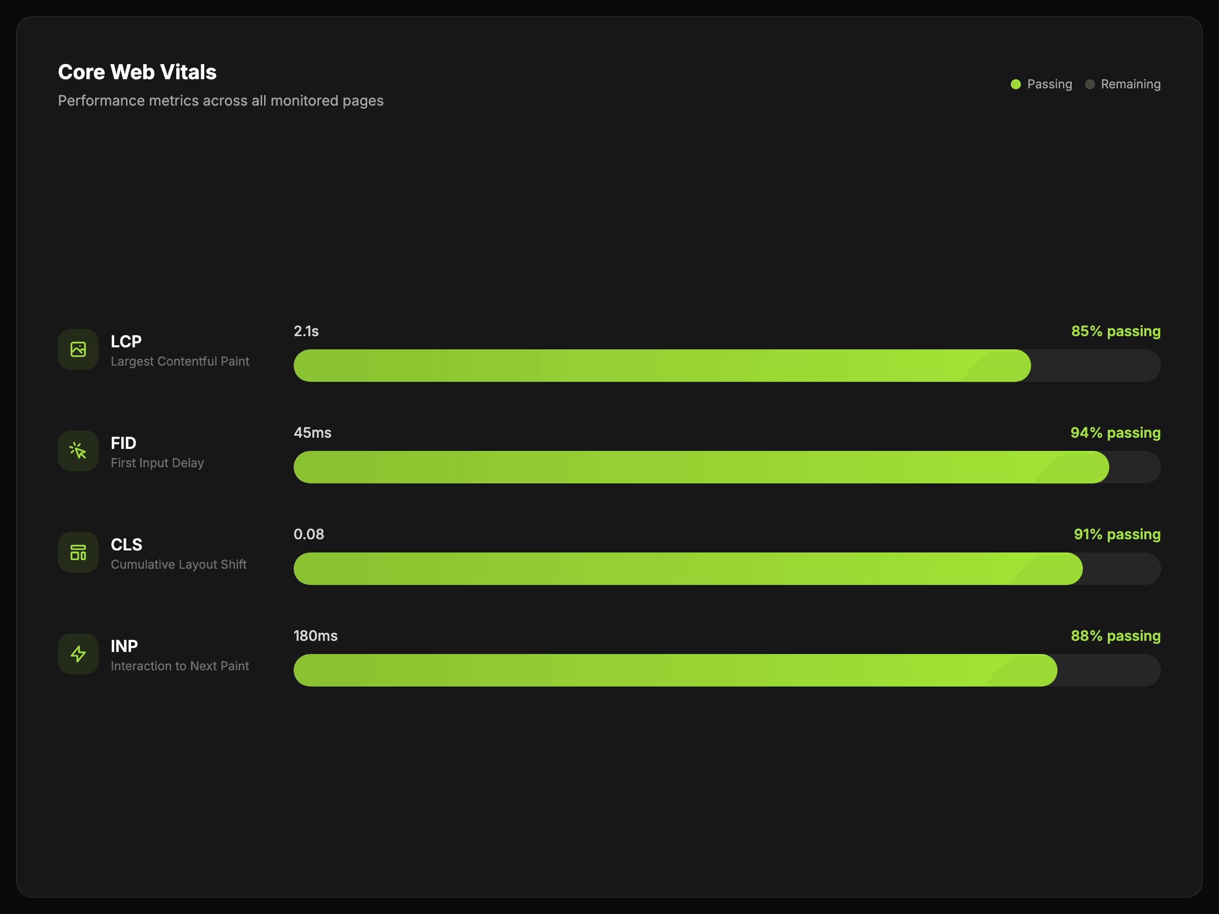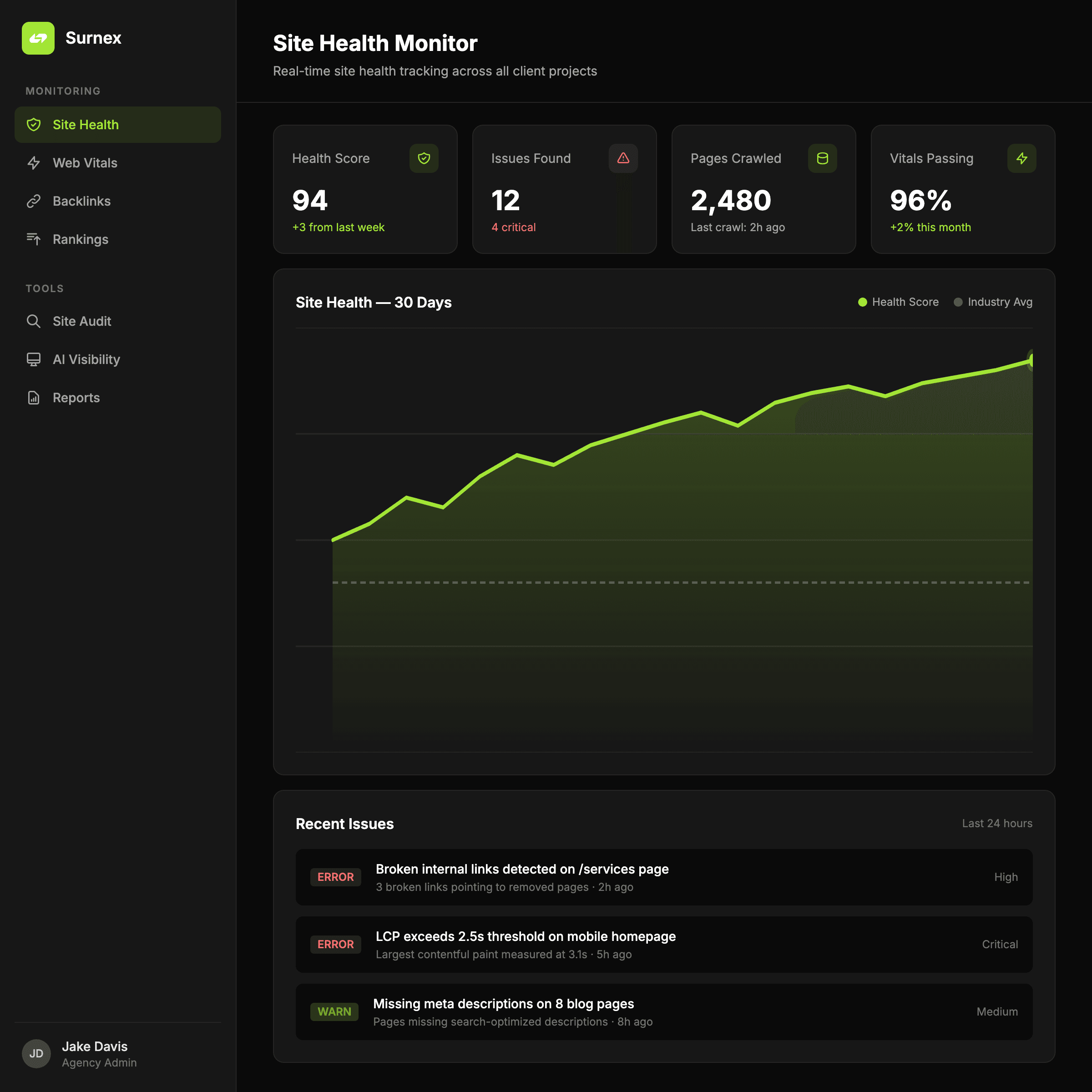 Track post-launch visibility, site health, web vitals, backlinks, and reporting so your agency stays valuable long after launch.