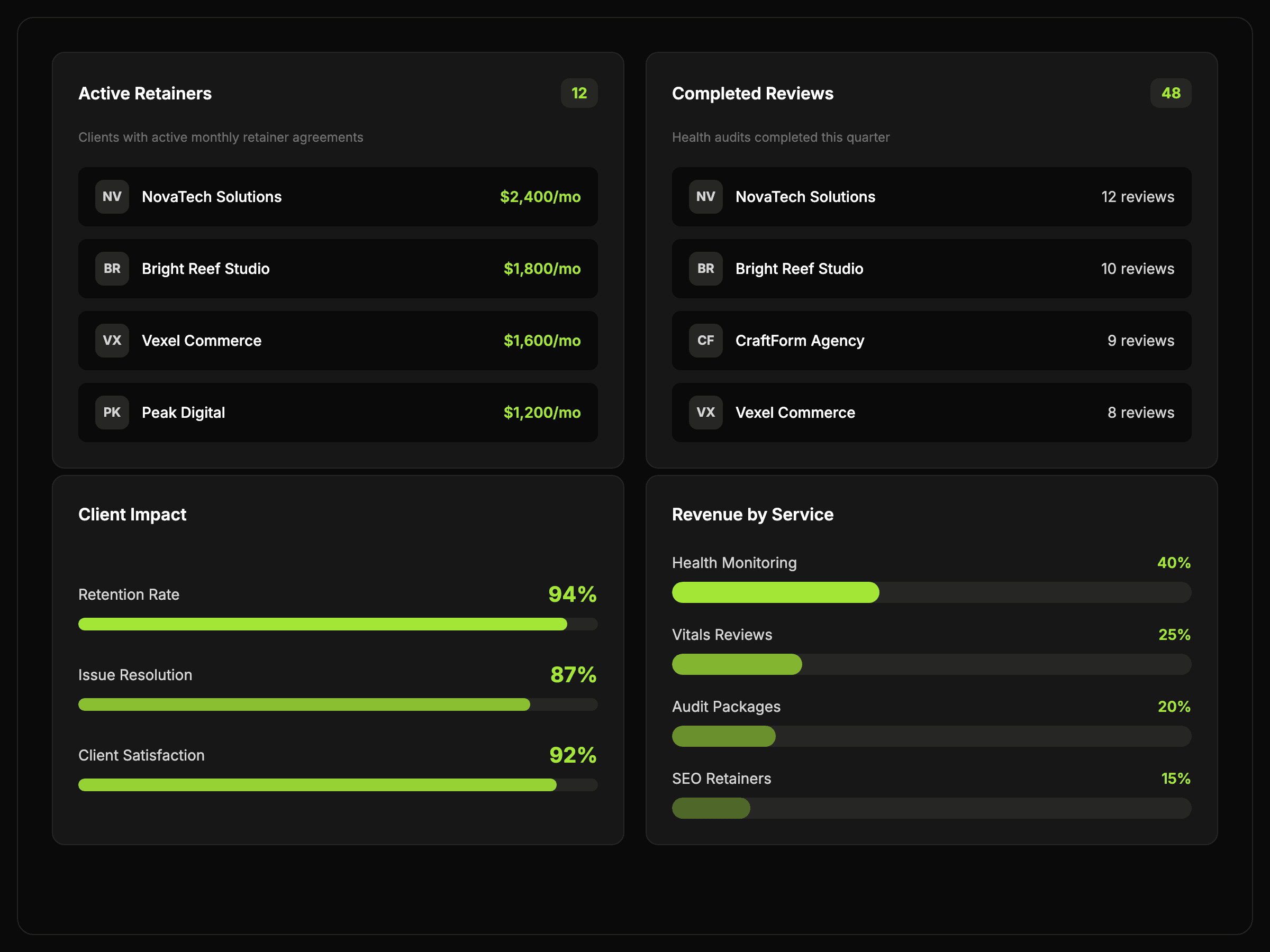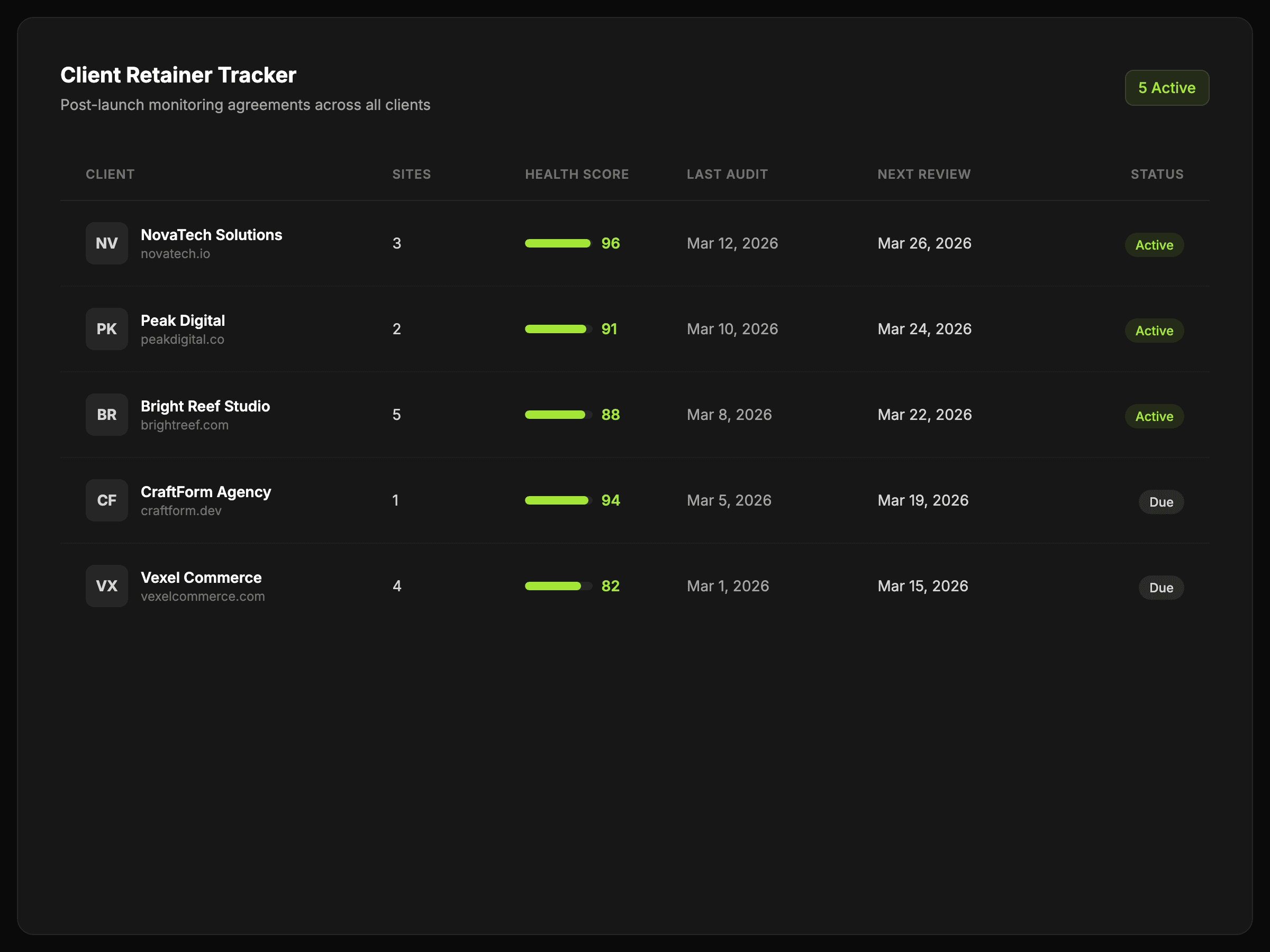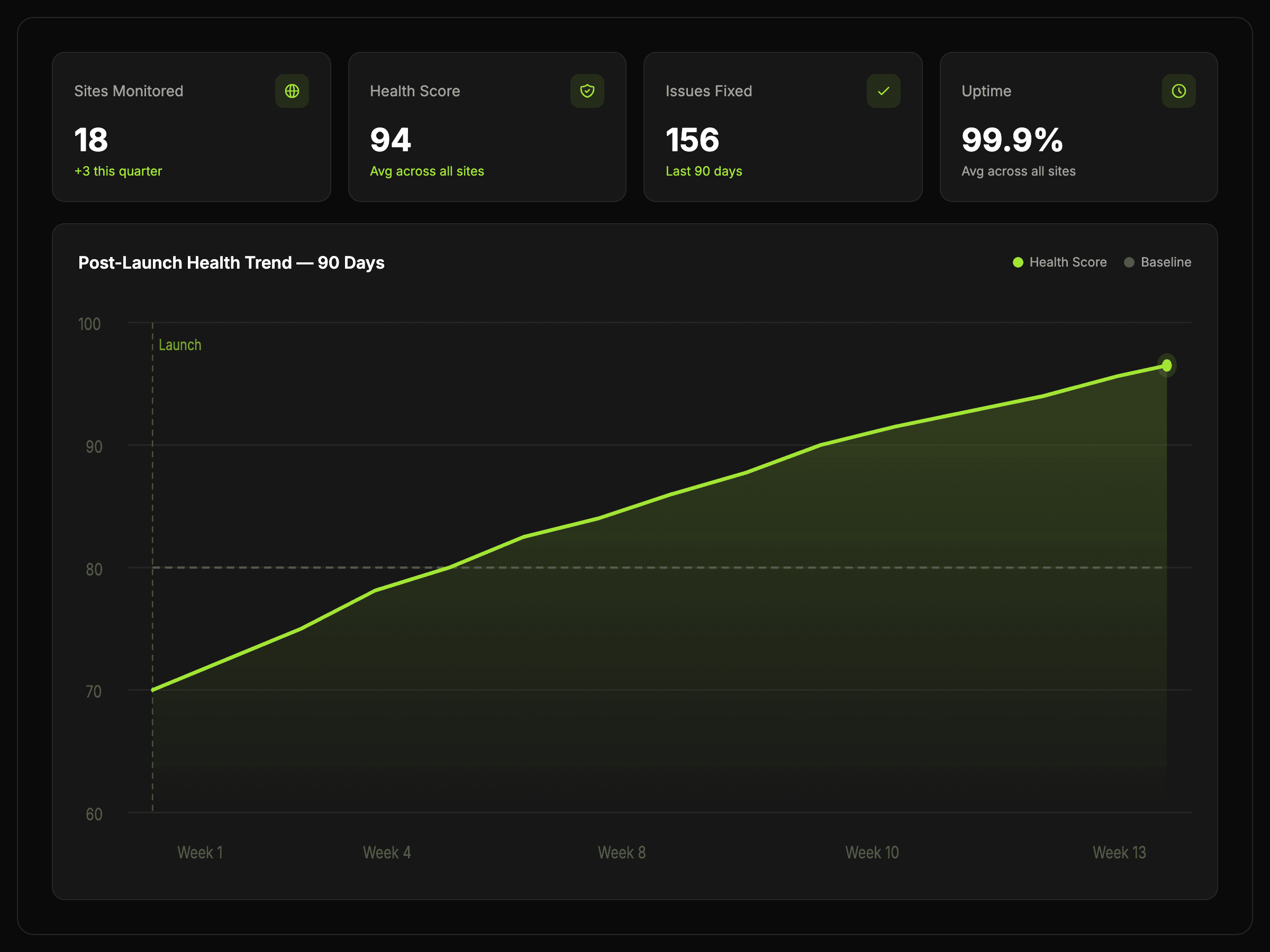 For agencies that want technical monitoring, search visibility, and recurring client reviews to extend value beyond the launch project.