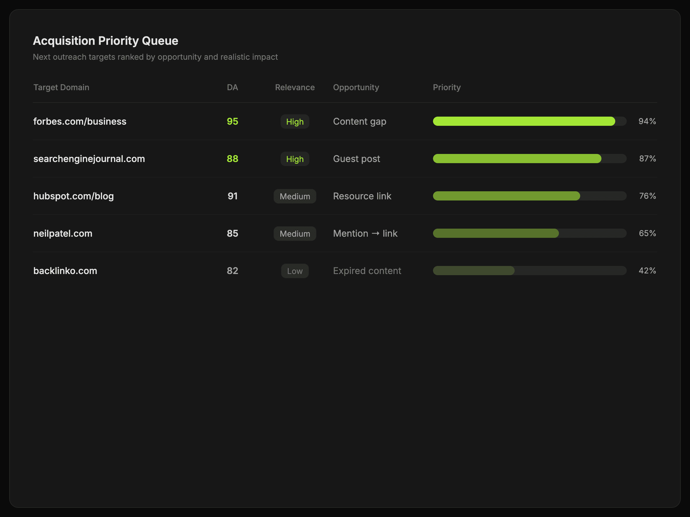 A more targeted outreach queue plus a clearer view of which pages, topics, or relationships deserve the next push.