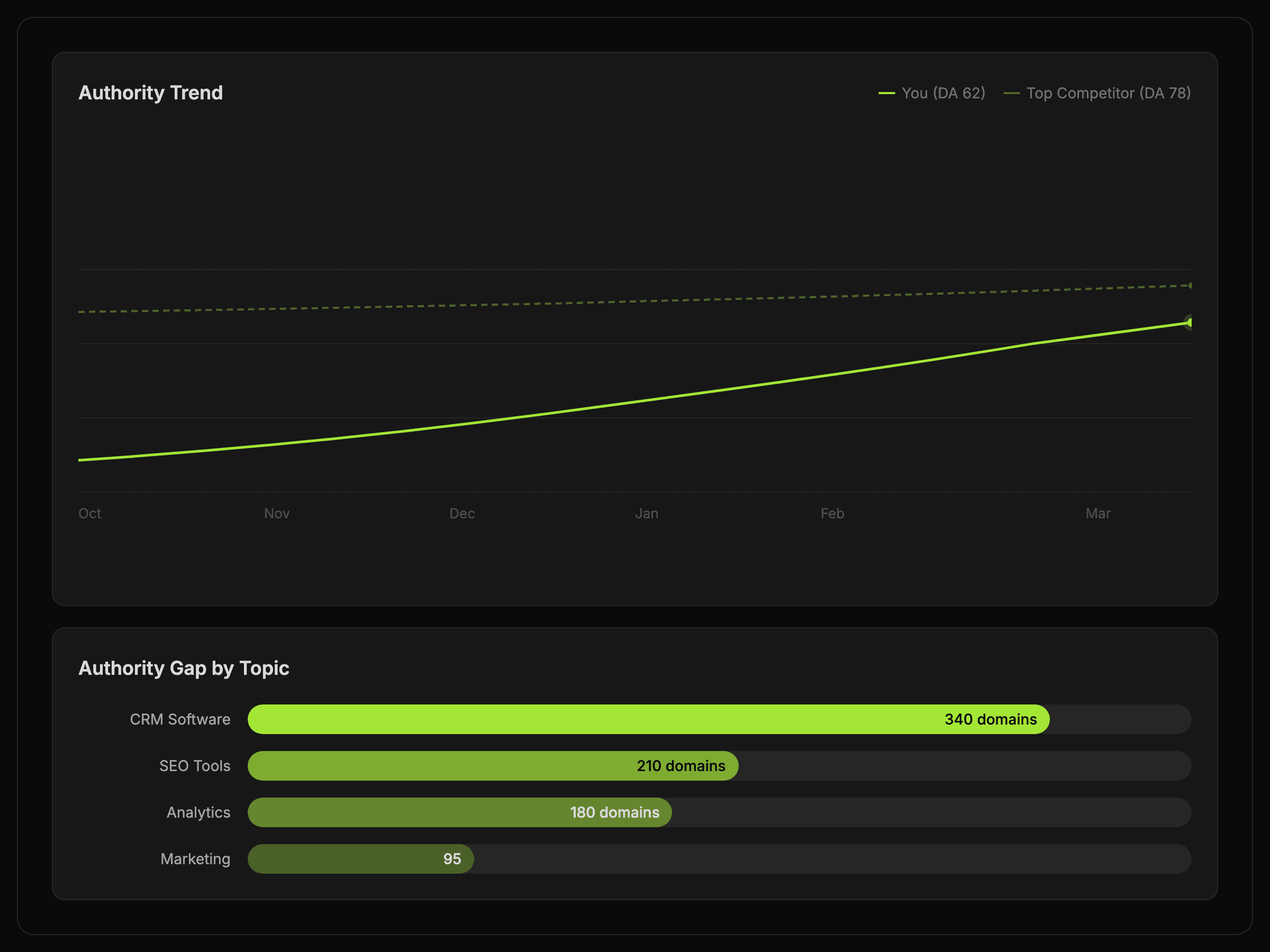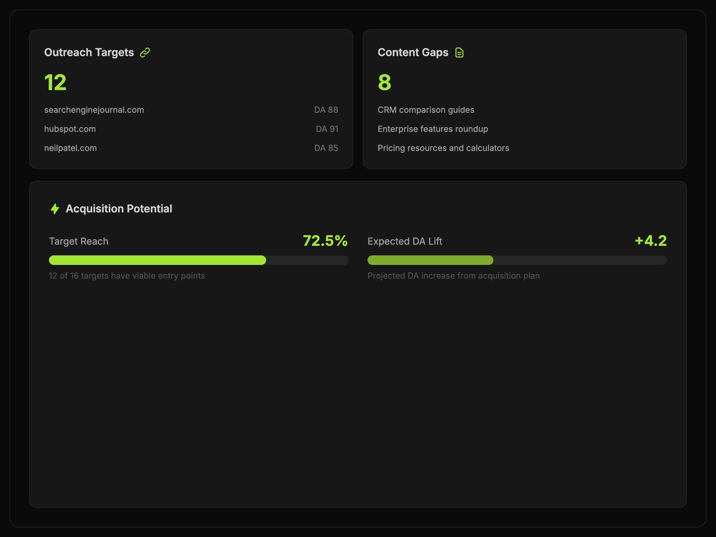 A profile health summary, a competitor gap view, and a shorter opportunity list built around realistic link and authority wins.