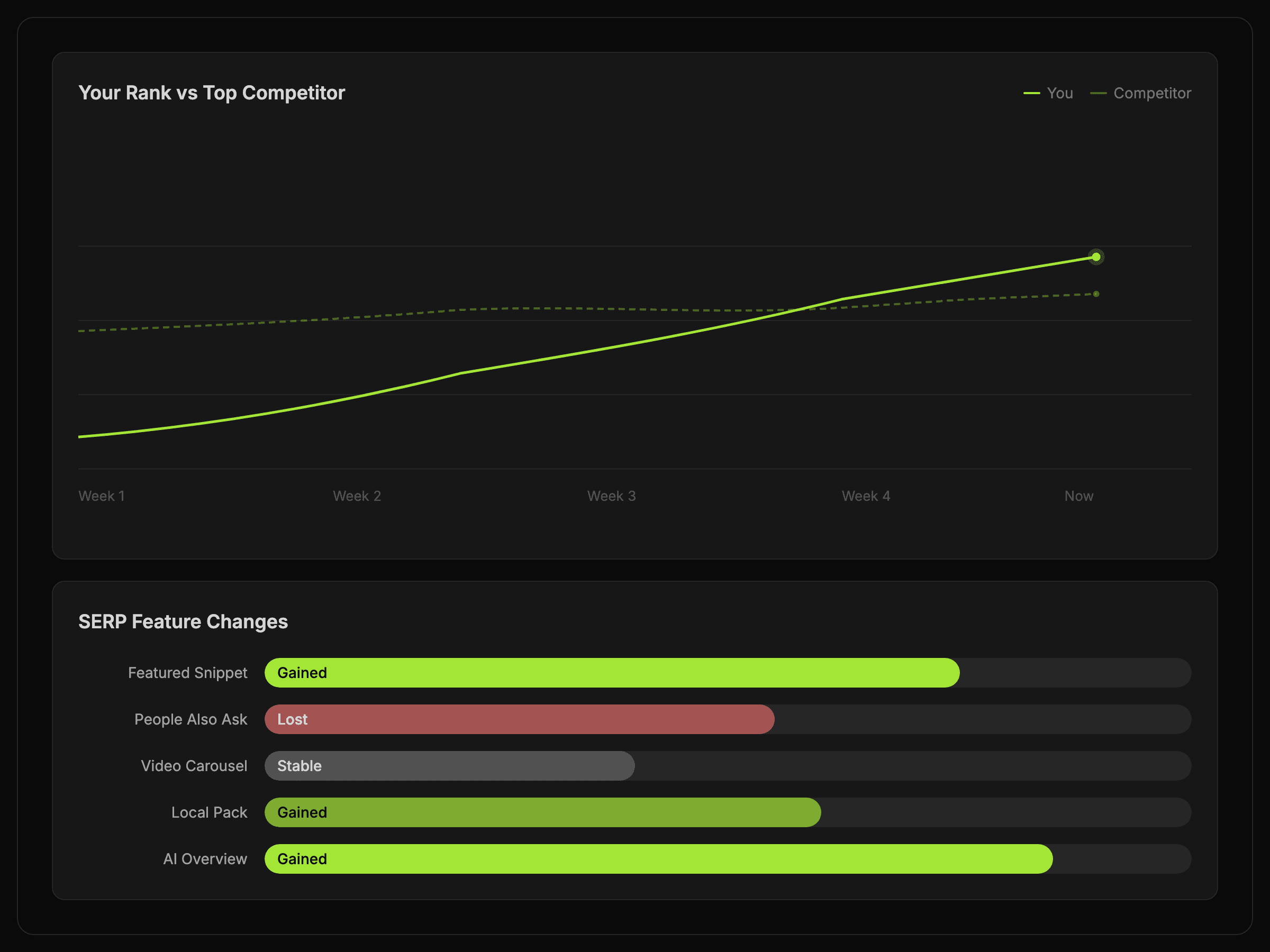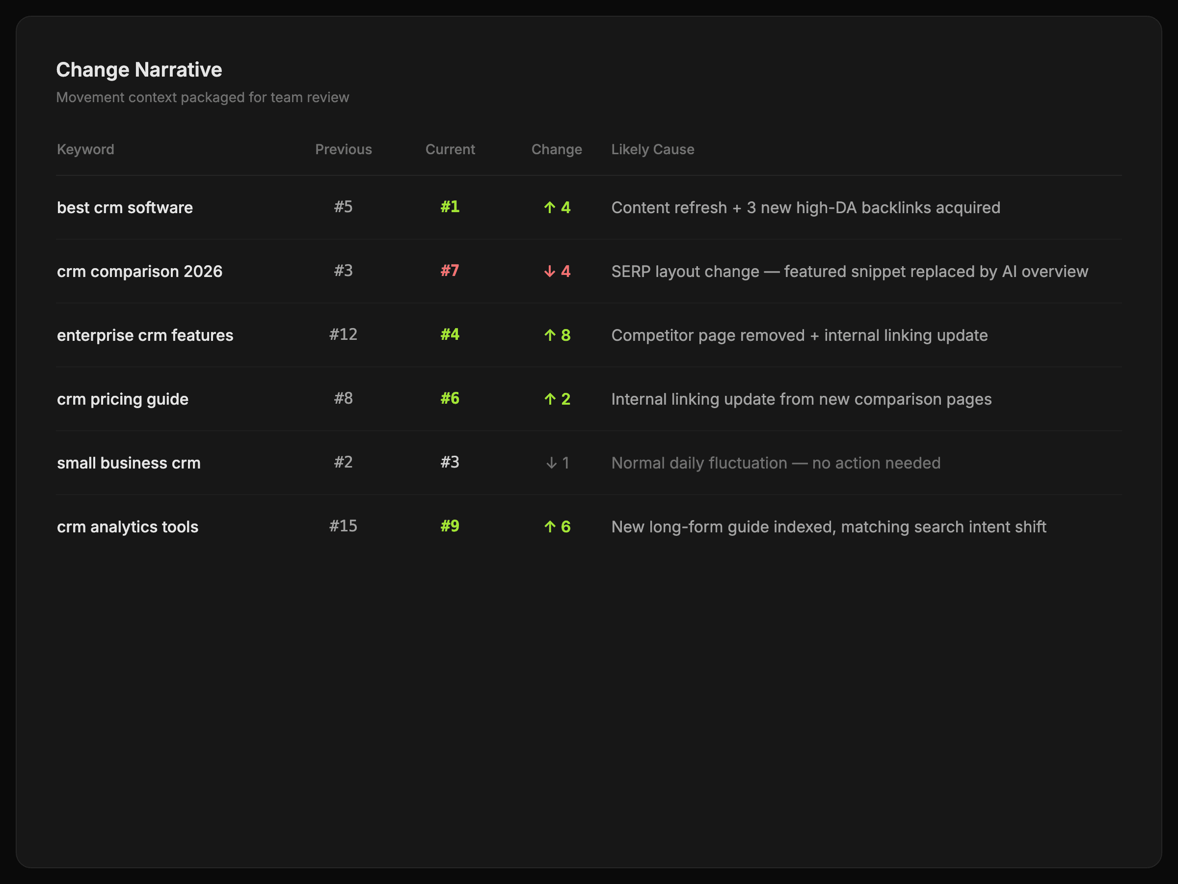 A change digest that combines ranking movement, competitor context, feature shifts, and likely causes in one readable summary.