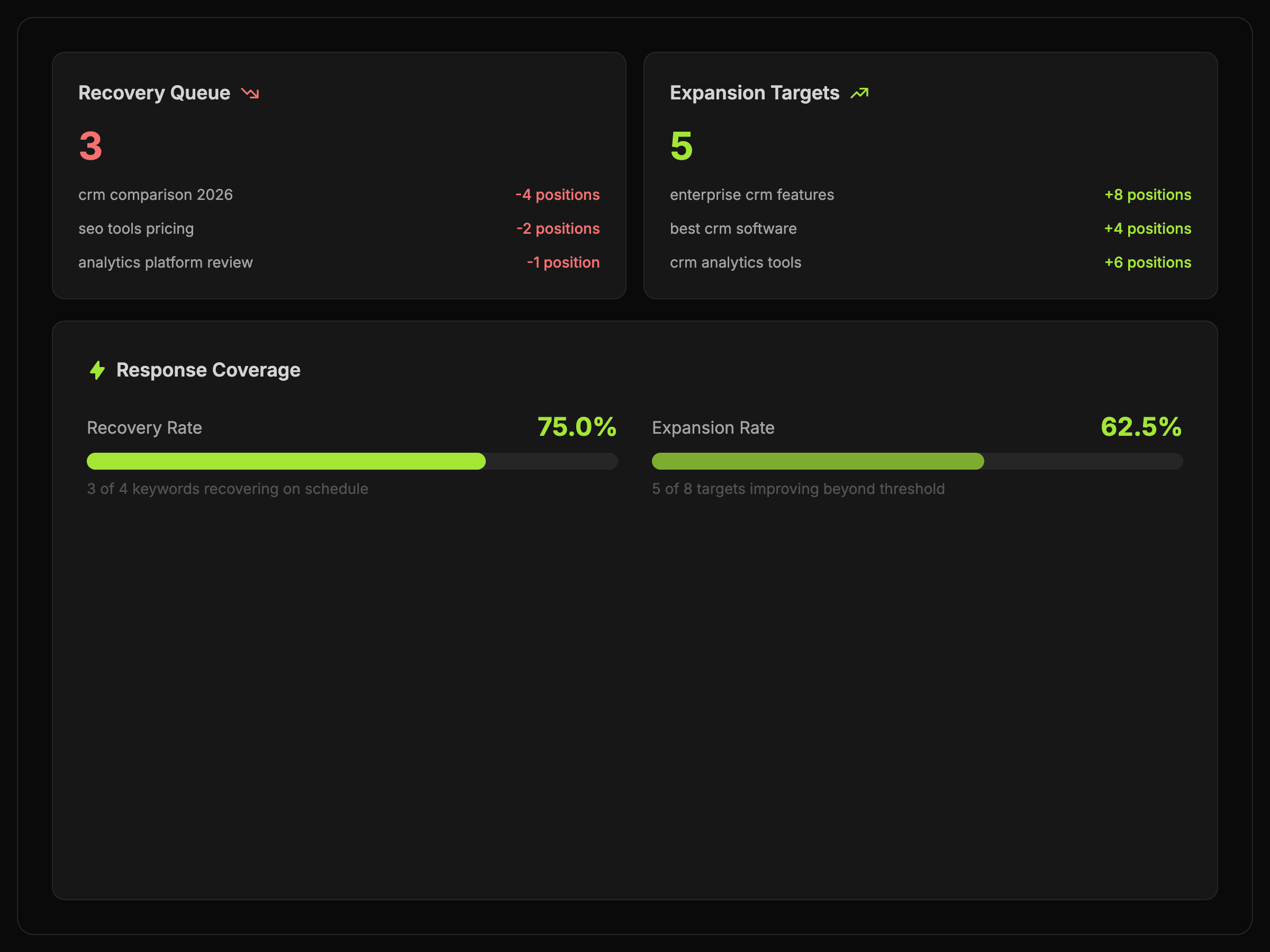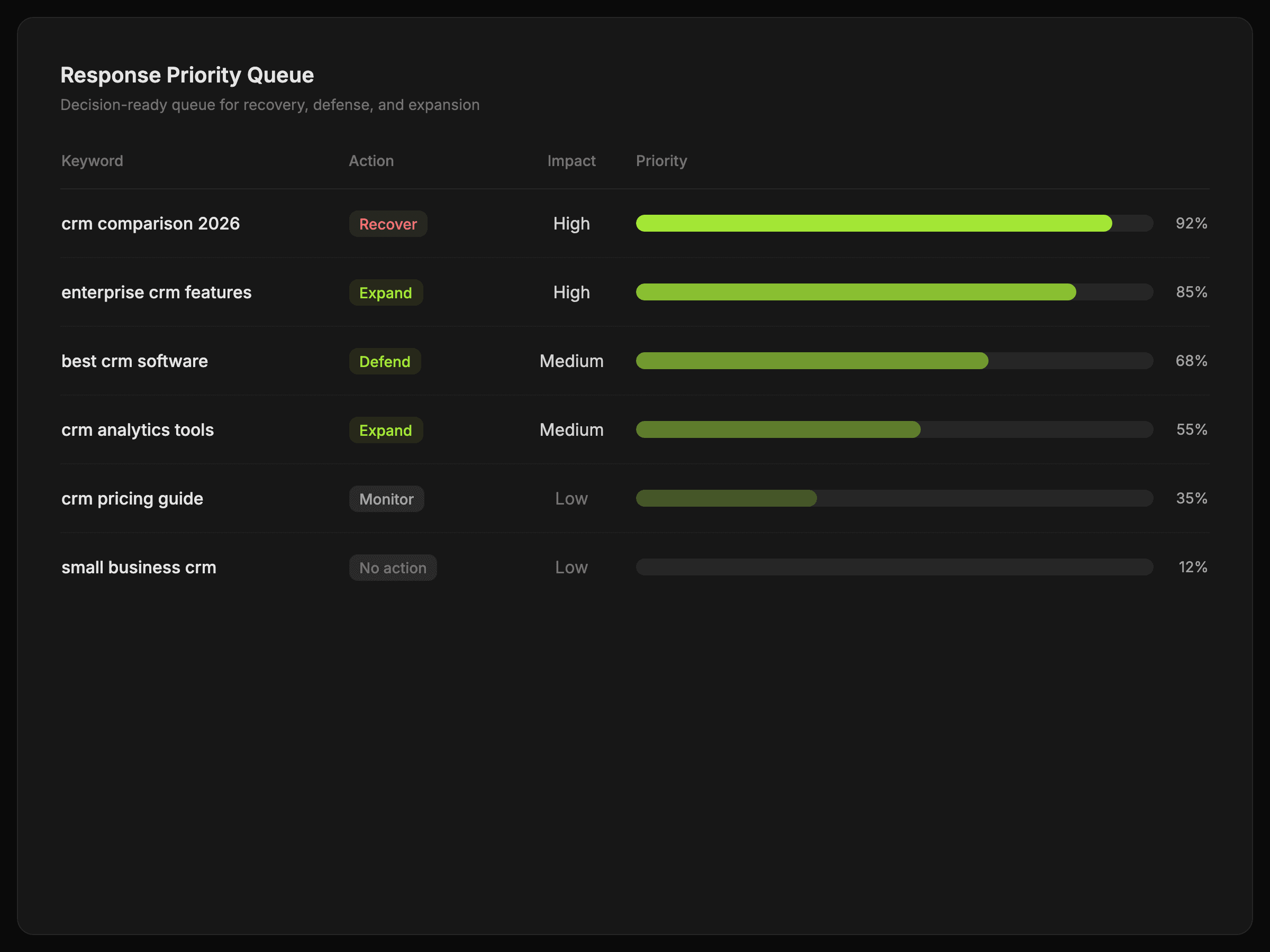 Turn rank changes into a decision-ready queue for recovery work, defensive action, or expansion.